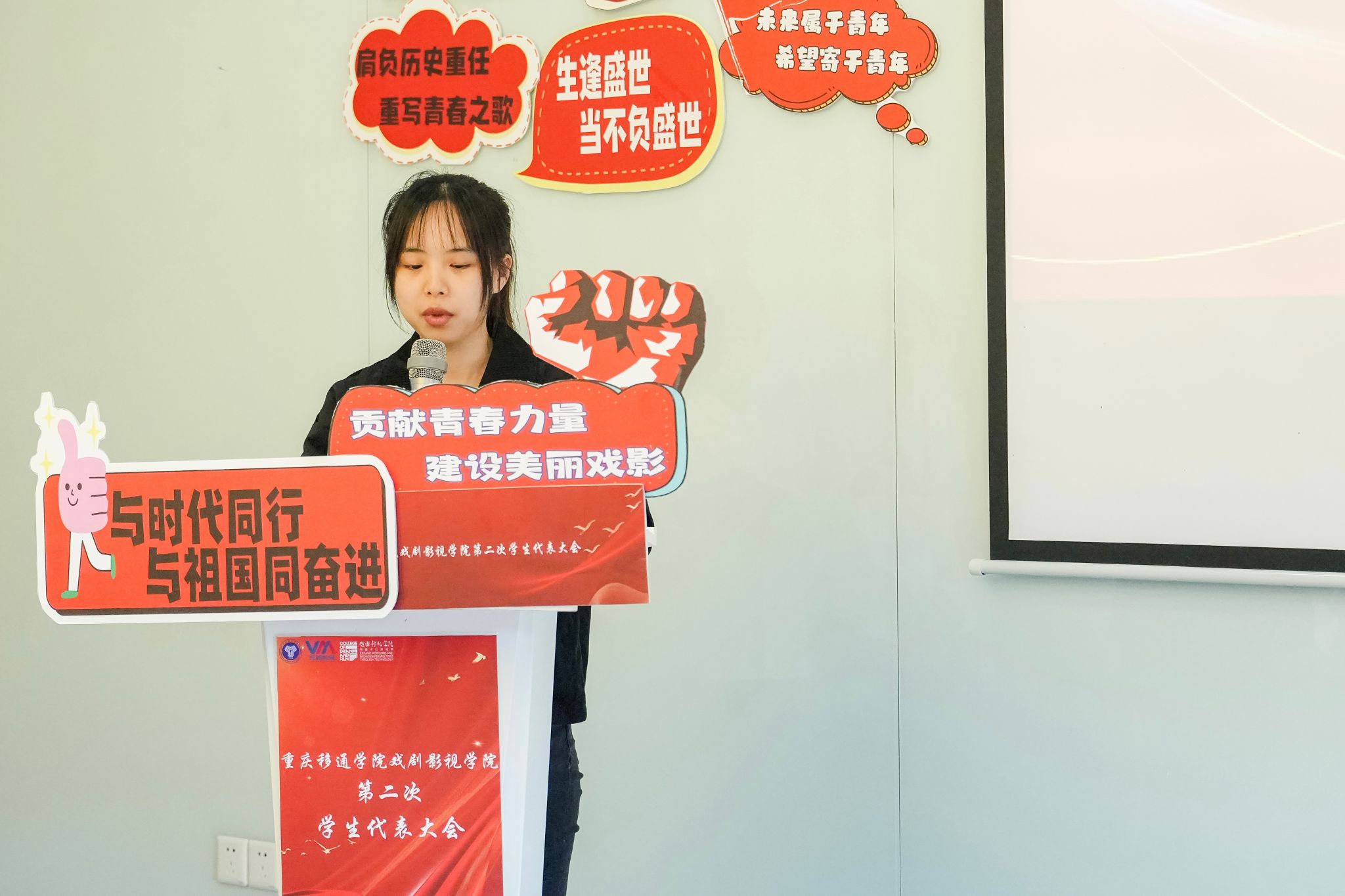 曹誉莹同志宣读校学生会《关于同意召开重庆移通学院戏剧影视学院第二次学生代表大会的批复》,并向此次大会的召开表示祝贺。