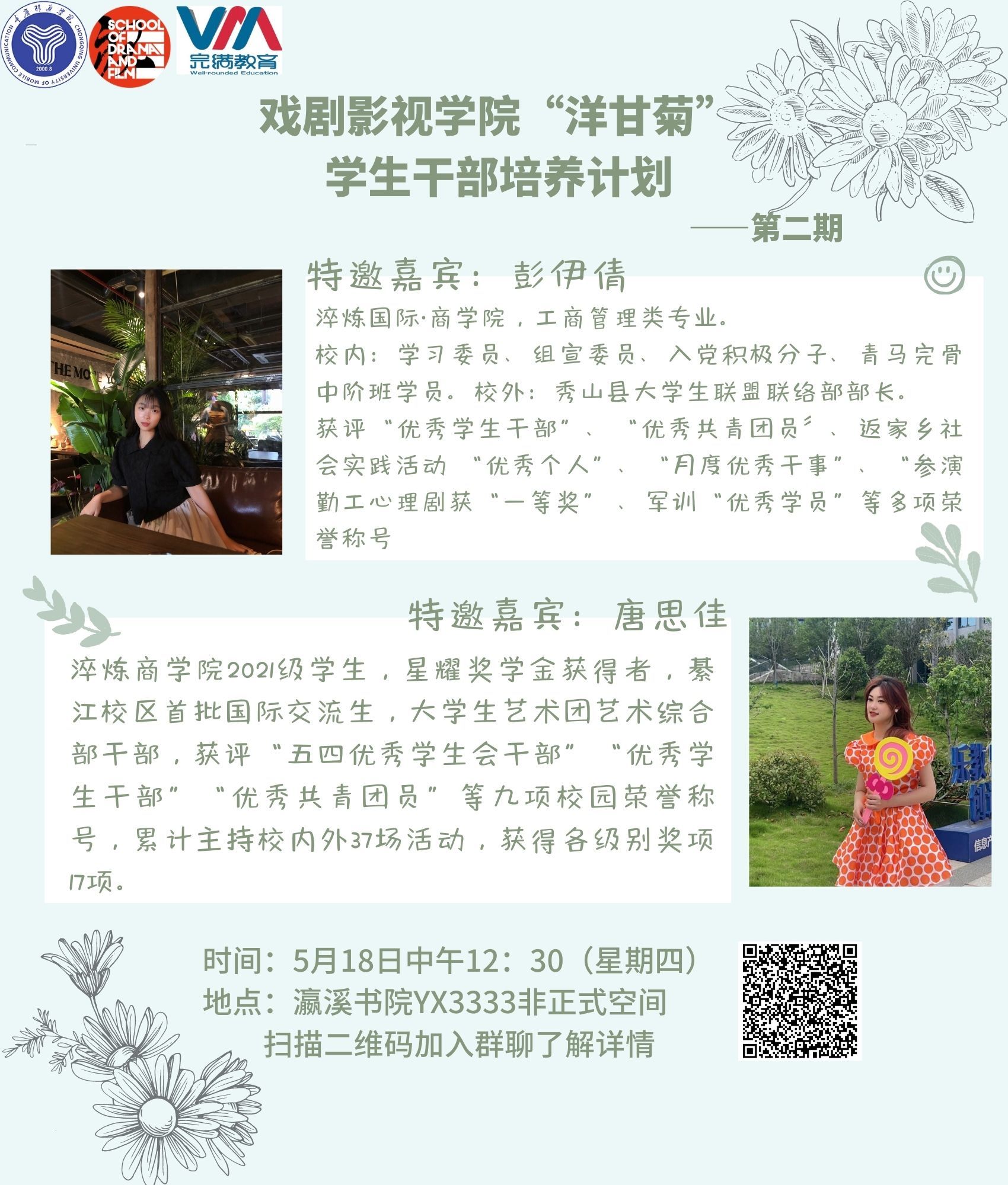 语言是思想的载体,高效准确的表达则会为我们的语言锦上添花。为提高学生干事的表达力与表现力,戏剧影视学院团总支于2023年5月18日中午12:30在瀛溪书院YX333如期开展洋甘菊学生干部培养计划第二期——学生干事表达力提升,本次培训邀请淬炼•国际商学院2021级学生干部彭伊倩学姐与唐思佳学姐主讲,本次培训由戏剧影视学院组织部谭吉棱同学主持。