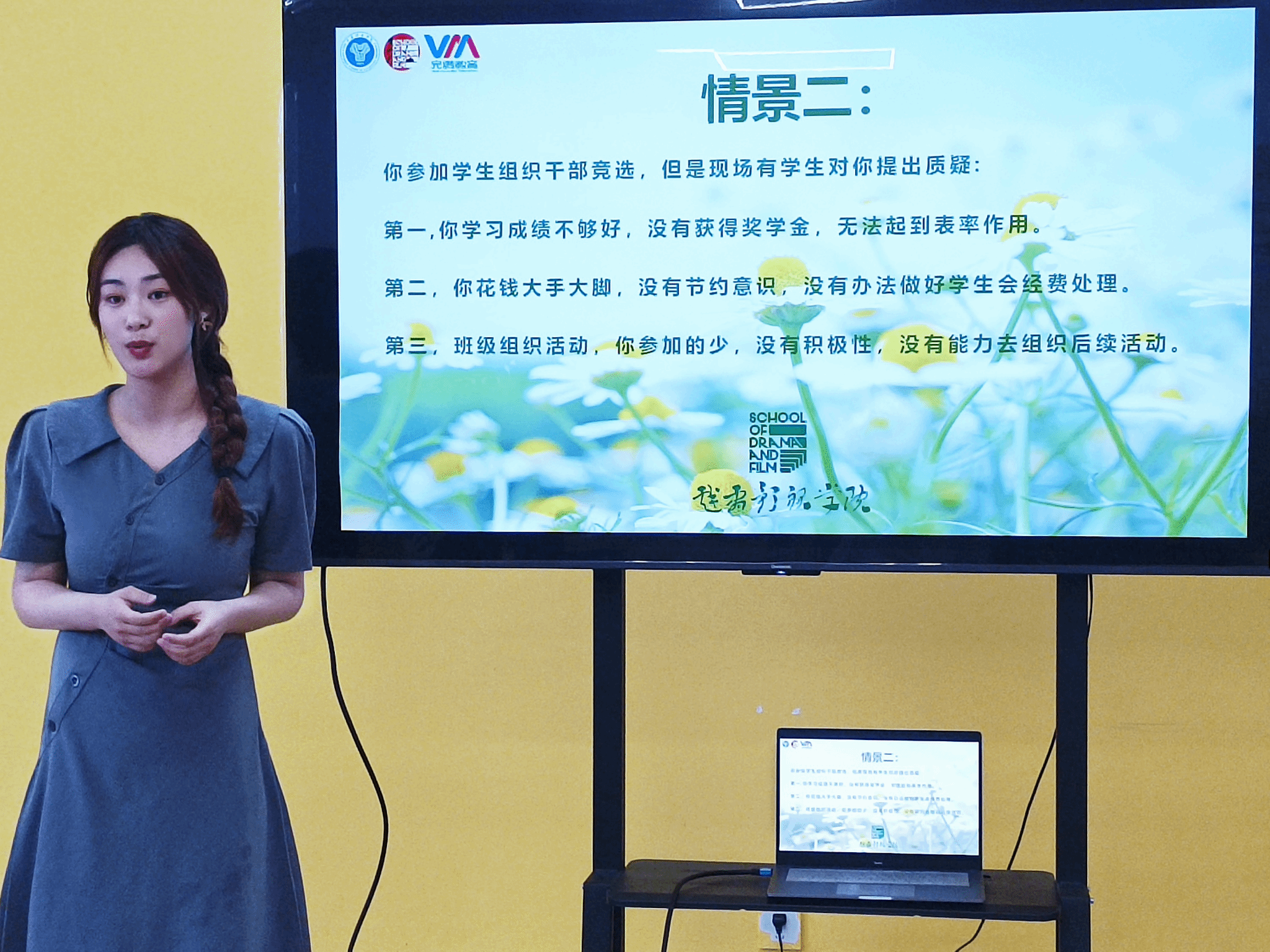 在他看来“要去找到一个链接人,分析对方需要什么,我们要提供的是什么,对症下药,达到最终的目的,坚持这种状态在以后跟别人沟通交流,也会有更好的一个效果。”在点评和分享的环节,彭伊倩学姐也根据他的回答表示肯定,向他给予肯定和赞扬。她也说到,同学们应该运用理性思维去找到一个问题的根本所在,面对困难保持热情,面带微笑。情景二是学生组织的干部竞选,现场有学生提出质疑,该怎么去回答别人对自己的质疑?在活动现场中,挑选了两个同学,这个问题阐述自己的应对方案,两位同学根据质疑做出自己的理解和看法。唐思佳学姐也对此提出自己的看法:在回答时要表达自己的态度时,分点作答,做到条理清晰的对提问者反驳,不能被牵着鼻子走。