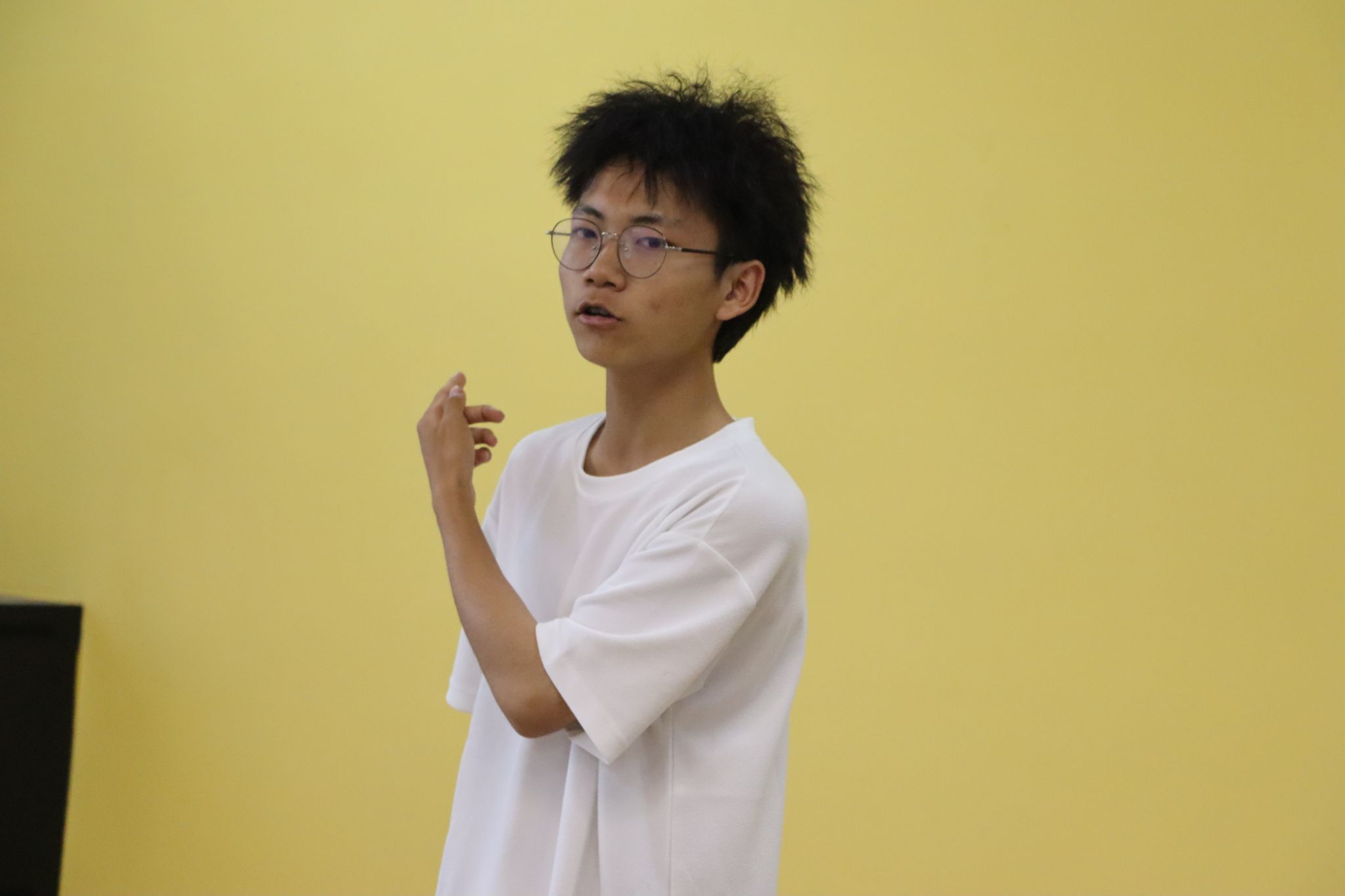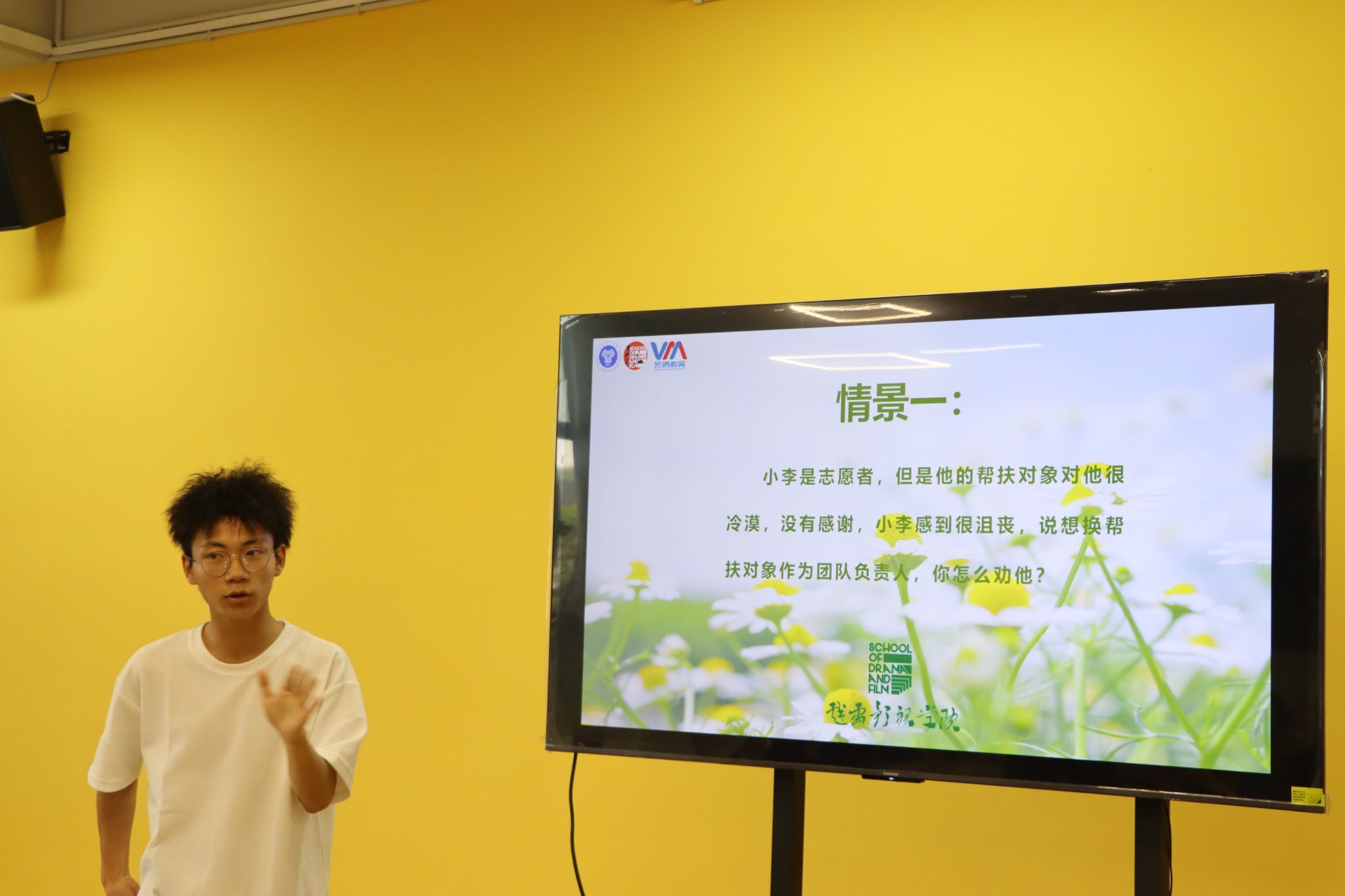 两位学姐结束了自己的分享之后,活动也进入到第三个环节,活学活用之情景表达,梁高智同学自告奋勇的表示自己愿意回答情景一这个设定,他向同学们分享了自己之前作为志愿者去参加幼儿园的经历,当时在活动出现了小朋友不愿意和志愿者进行沟通,不愿意同小朋友参与到游戏当中等问题。他立即向园长了解情况,发现问题根源所在,然后及时作出合理的解决方案。