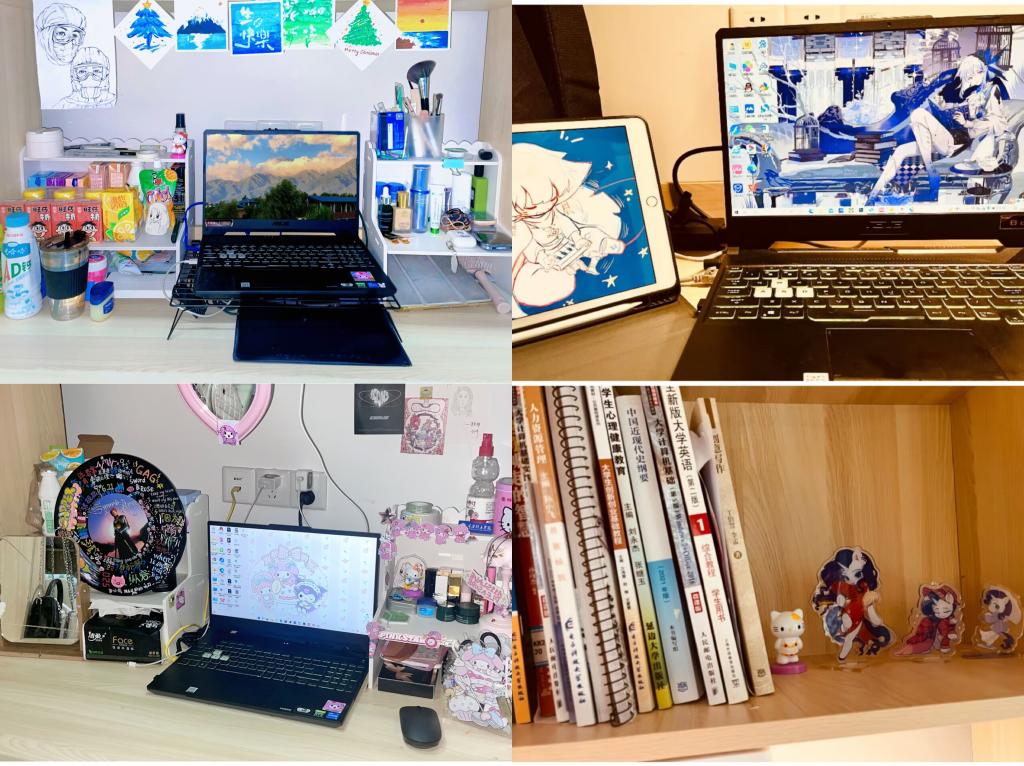 “才须学也。非学无以广才,非志无以成学。”213在学习上也毫不懈怠。上课认真听讲,课后认真完成作业,有问题就在互帮互助的融洽氛围中轻松解决。除了“本职工作”,在学校“完满教育”的影响下,213作为戏剧影视学院动画专业的戏娃们,也个个身怀绝技,各显神通。她们用田园清纯风、未来科技风、可爱童趣风、传统中国风共同织就独属于213的多彩学风,运用简笔画描绘着宿舍日常的暖心故事。213坚信,学习无捷径,但努力终可登高峰。