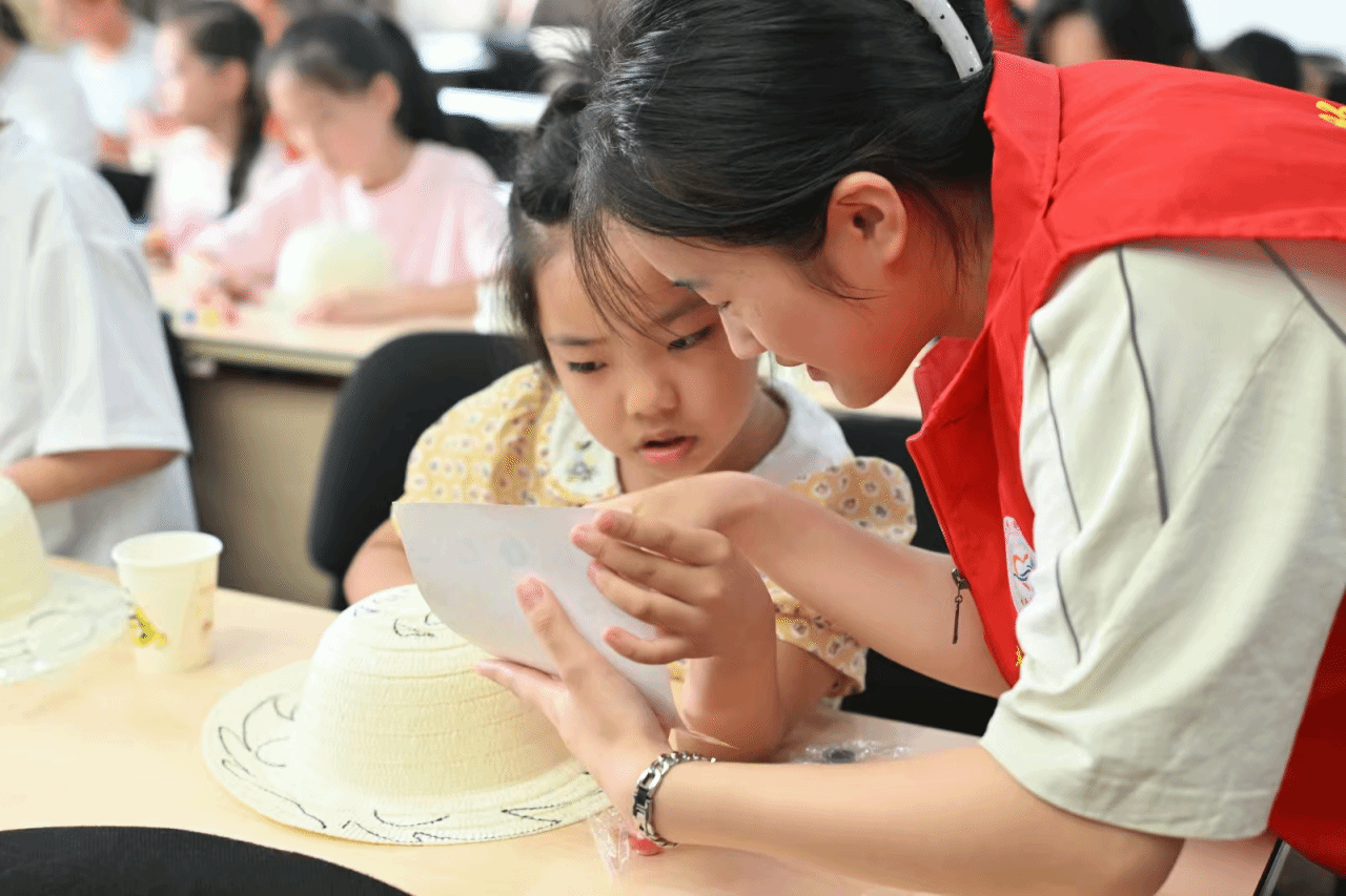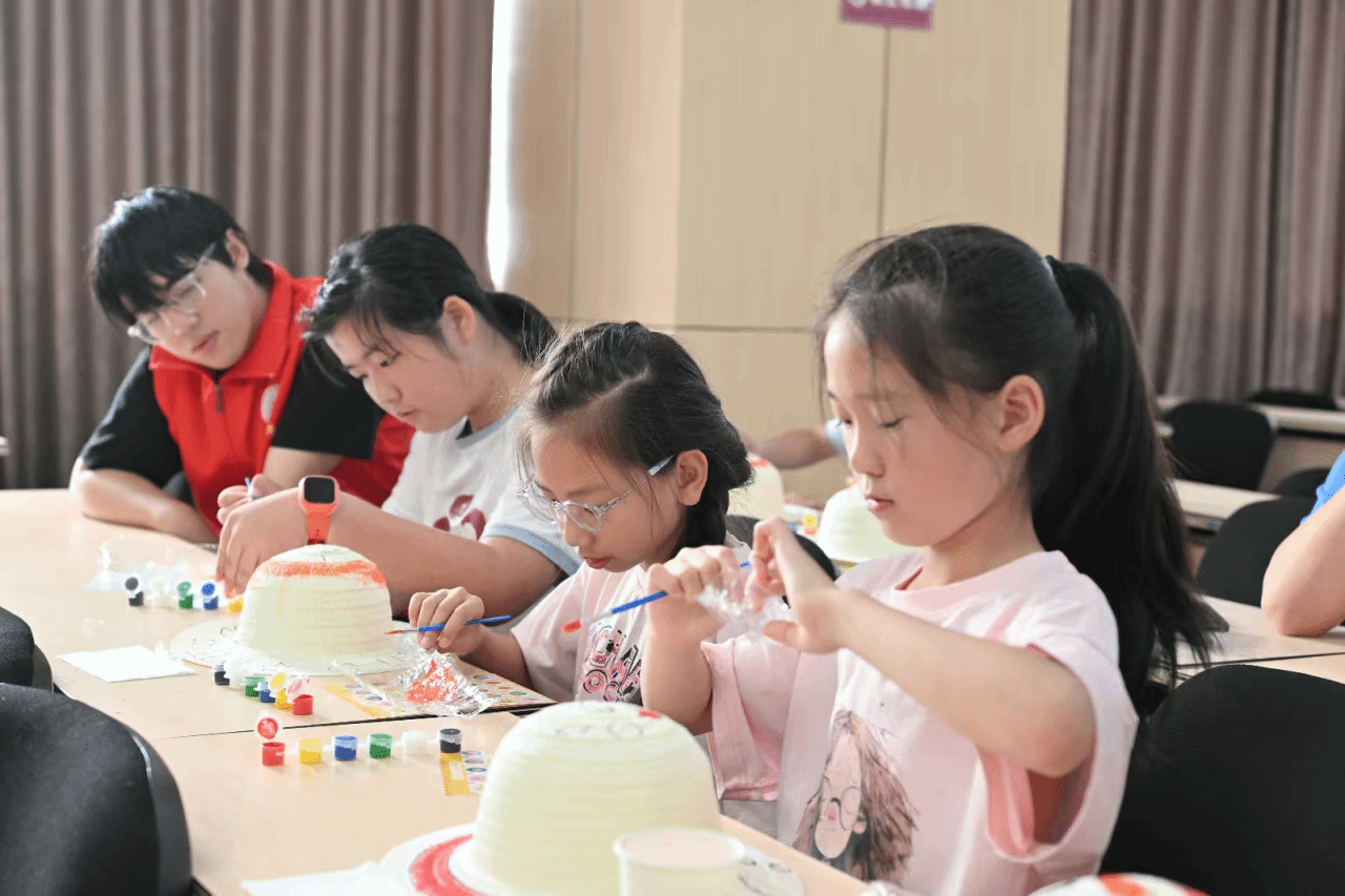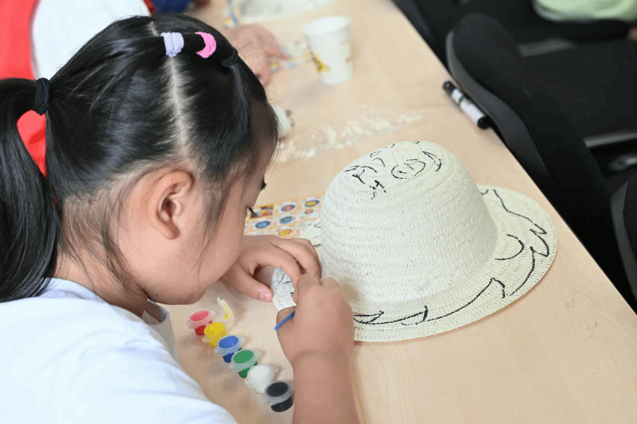 游戏结束后,手工制帽环节正式开启。主持人通过视频讲解、实物演示与分步教学,细致传授帽子DIY技巧。随后,志愿者一对一陪伴指导,孩子们拿起颜料、辅料,发挥创意,将奇思妙想融入帽饰创作。不一会儿,空白帽胚在小巧手下“变身”,成为独一无二的艺术作品。制作完成后,孩子们兴奋展示成果,分享创作灵感,脸上洋溢着自豪笑容。