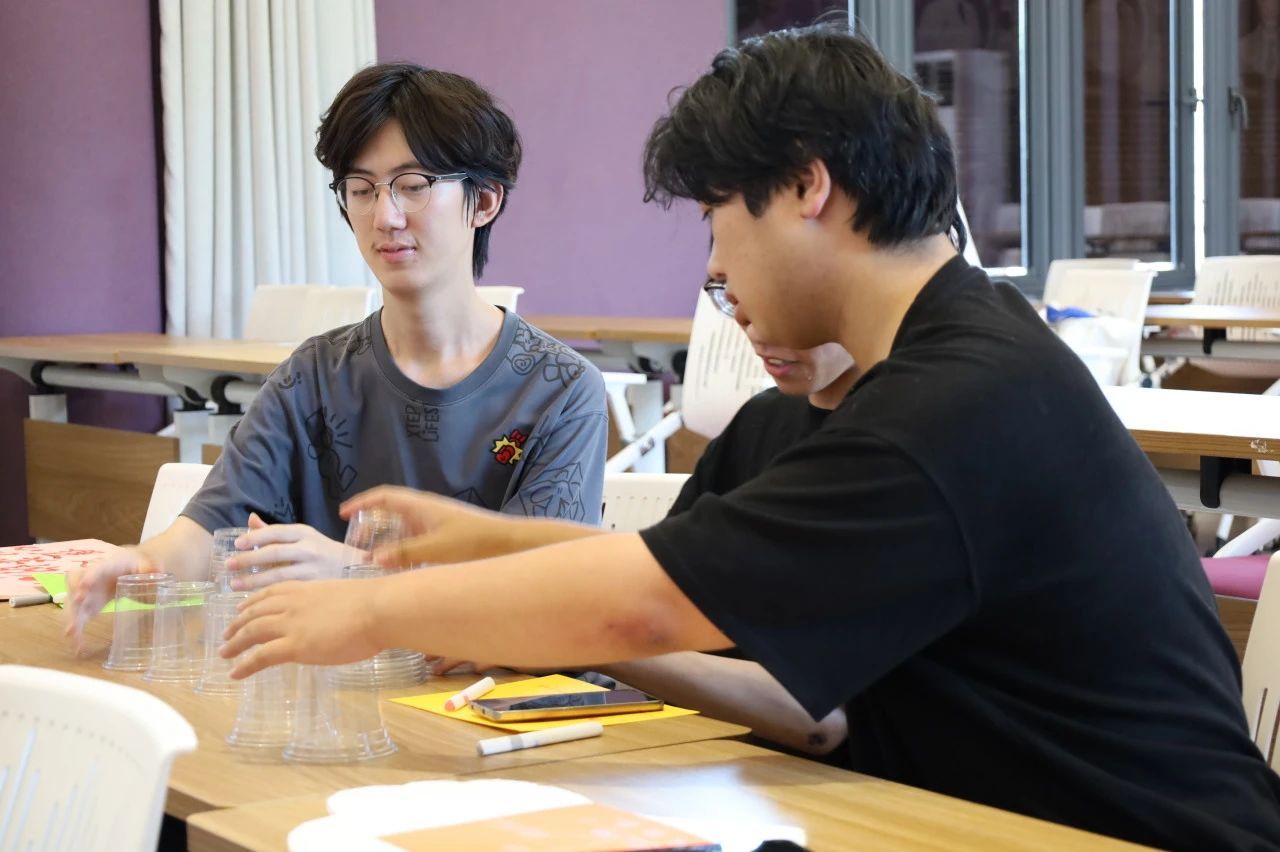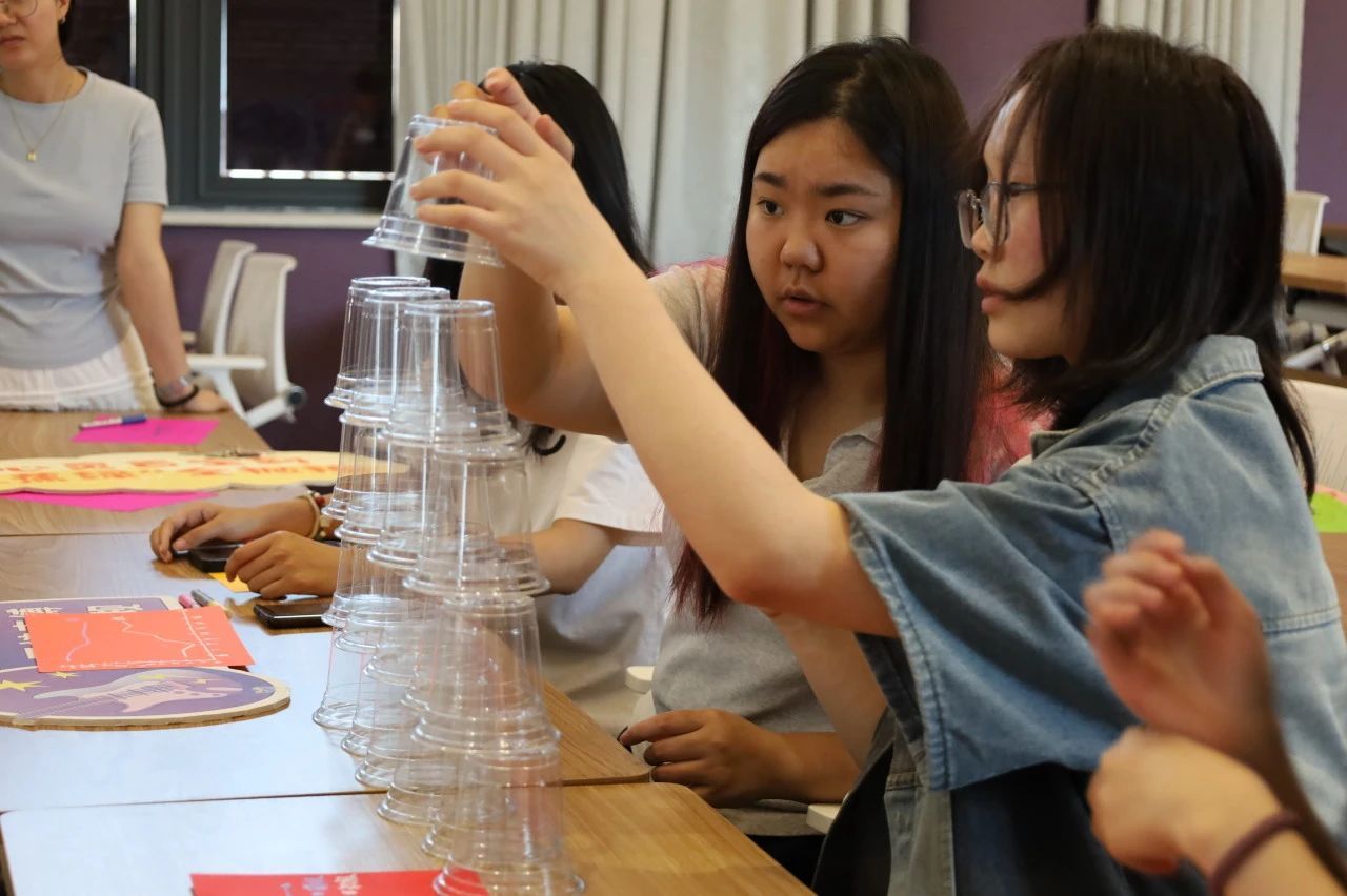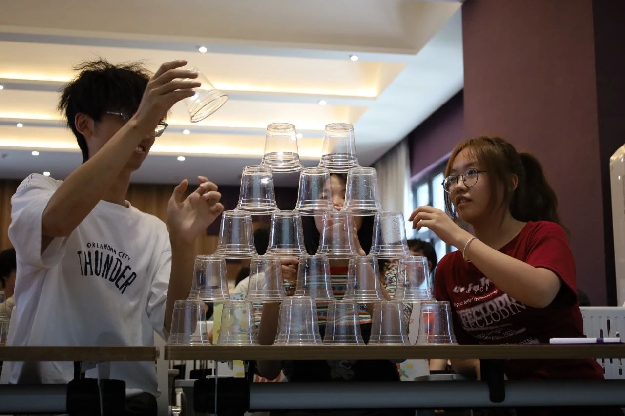 随后,“纸杯叠叠乐” 团队挑战点燃现场热情。小组为单位合作搭建五层纸杯塔,在专注与协作中,焦虑被悄然转移。在这个过程中,可能会遇到“杯子倾倒”“节奏不一致”的状况,就像期末复习时,遇到难题、计划被打乱的压力。有的同学感到复习时被难题卡住的无奈;有的同学说好似计划被打乱的手忙脚乱,但是坚持努力,同样可以做到;还有同学提到从中懂得了调整节奏、互相配合才能攻克压力。让师生在趣味互动里收获积极体验,强化心理韧性。