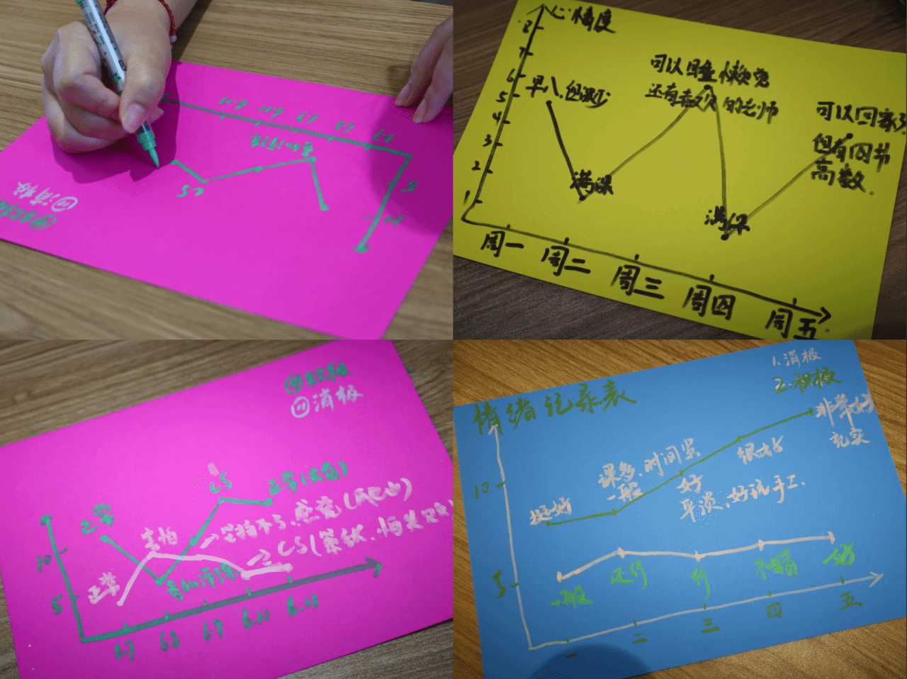 绘制完毕后,同学们踊跃交流,分享了自己的“情绪曲线”,有的同学说:“看着自己的情绪曲线,发现一到复习专业课理论知识时,焦虑值就飙升,原来这是压力的‘重灾区’。”有的同学提到:“我的情绪曲线起起伏伏,因为备考中一会儿觉得知识掌握不错,一会儿又被难题困住,明白情绪波动是正常的。”还有的同学说:“通过标注情绪,清楚看到周末放松时情绪平稳,周内复习压力大就容易烦躁,可以适当劳逸结合。”这些分享,让同学们对自身情绪规律有了更深的了解,也在交流中汲取应对压力的灵感。