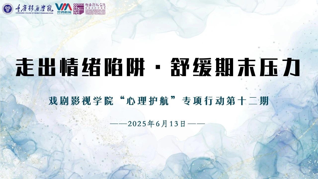 期末正在进行时,结课考核、论文、备考等多重任务压身,不少同学都容易陷入焦虑、失眠、效率低下的困境。学业任务堆积、时间紧迫带来的压力,为帮助师生识别情绪困境,掌握压力调节方法,建立积极应考心态,6月13日,戏剧影视学院身心发展部于观云书院冬至·多媒体功能室开展了“走出情绪陷阱・舒缓期末压力” 心理护航专项行动第十二期,为师生定制专属 “心理解压锦囊”,以更健康的状态冲刺期末。