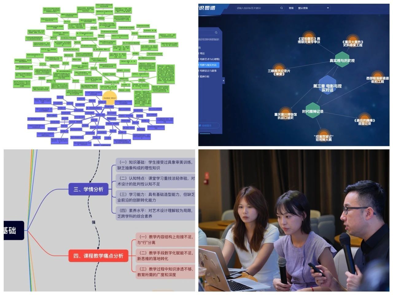 6日下午,参培教师以课程组为单位展开沉浸式实操,在刘学莘教授的指导下探索并梳理所教授课程“知识点-能力点-思政点”的逻辑关系,并初步完成课程知识图谱的搭建。《构成基础》课程组率先尝试通过“AI课程设计四步法”:用DeepSeek智能引擎撰写OBE理念下的教学目标,通过Kimi工具挖掘课程中的特色化、本土化思政元素,再借助通义千问生成思维导图,最终导入超星平台形成动态调整的知识图谱。