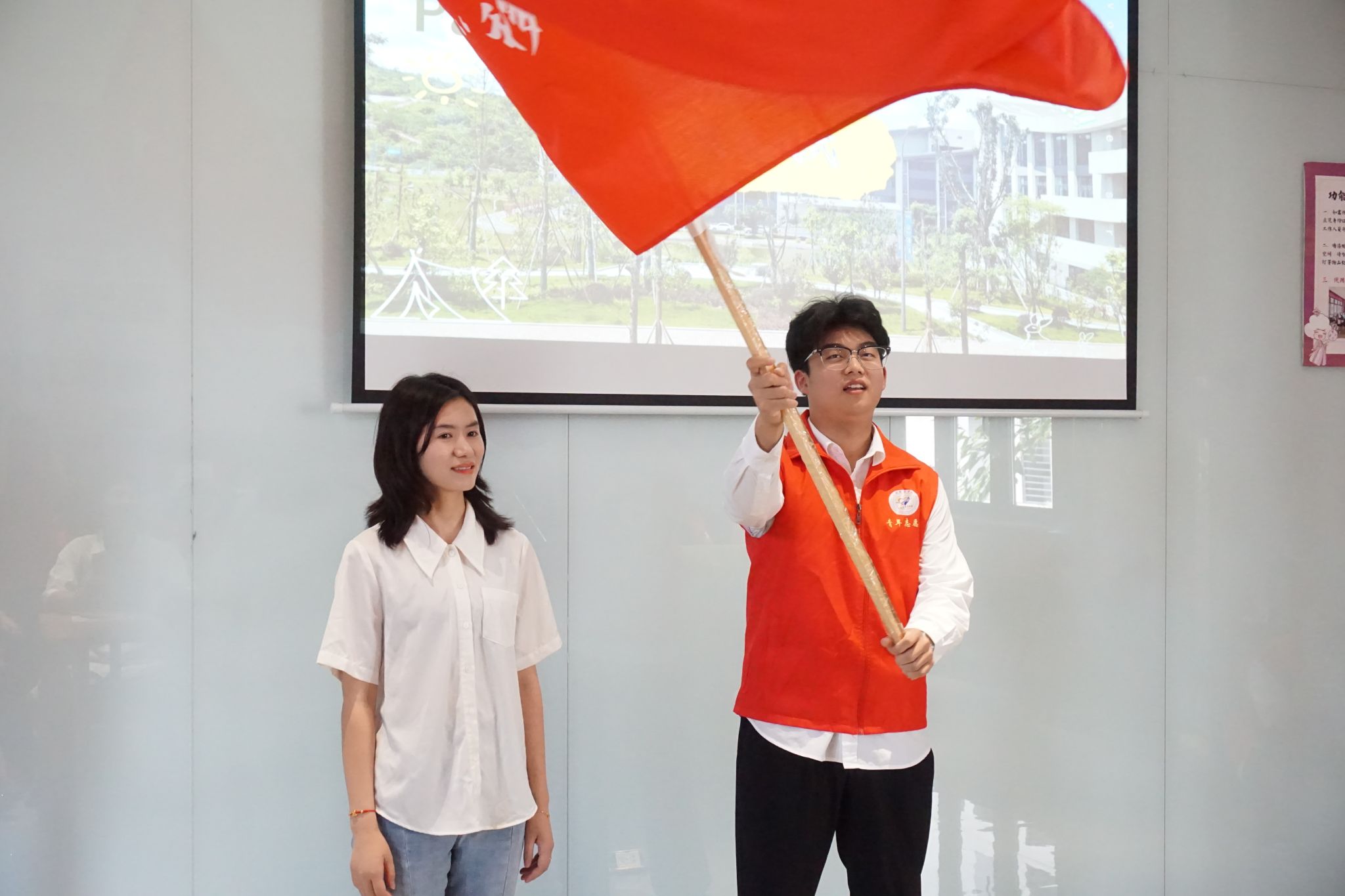 激昂热烈的授旗环节随即展开,李梦雪老师分别为两支队伍授旗。 当印着“瀛风去文化艺术服务团”、“移綦安理论普及宣讲团”醒目标识的旗帜传递到挥旗队员手中,不仅标志着戏剧影视学院三下乡志愿服务实践征程正式启航,更意味着2025年大学生暑期“三下乡”社会实践活动的大幕就此拉开。戏娃们将牢记使命担当,在基层实践中践行青年责任,书写青春答卷。