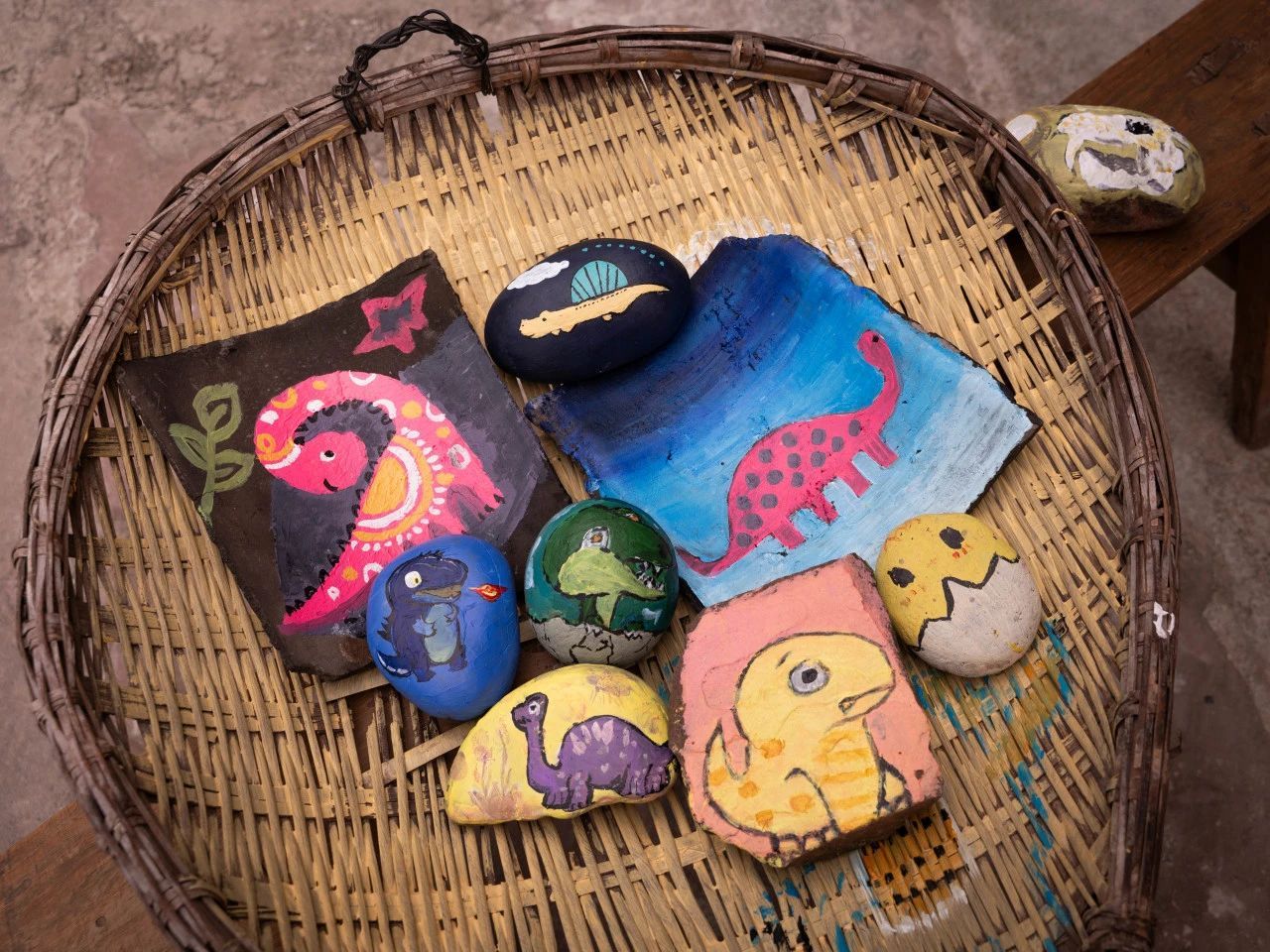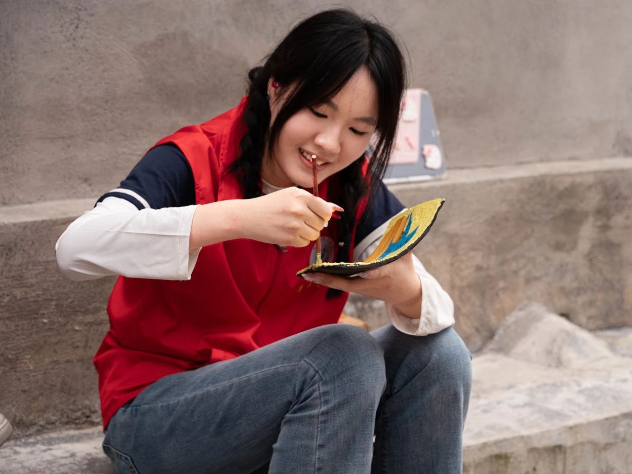 岁月失语,惟物能言。志愿者们发挥专业特长,针对每件旧物的特点巧妙改造:斑驳的长板凳被绘上乡土风情的图案;破旧的瓦片与木板经彩绘点缀,成了别致的装饰;收集的纸板则被精心剪裁拼贴,生动展现三下乡的精彩瞬间,让被岁月尘封的旧物,在艺术重塑中焕发新生。