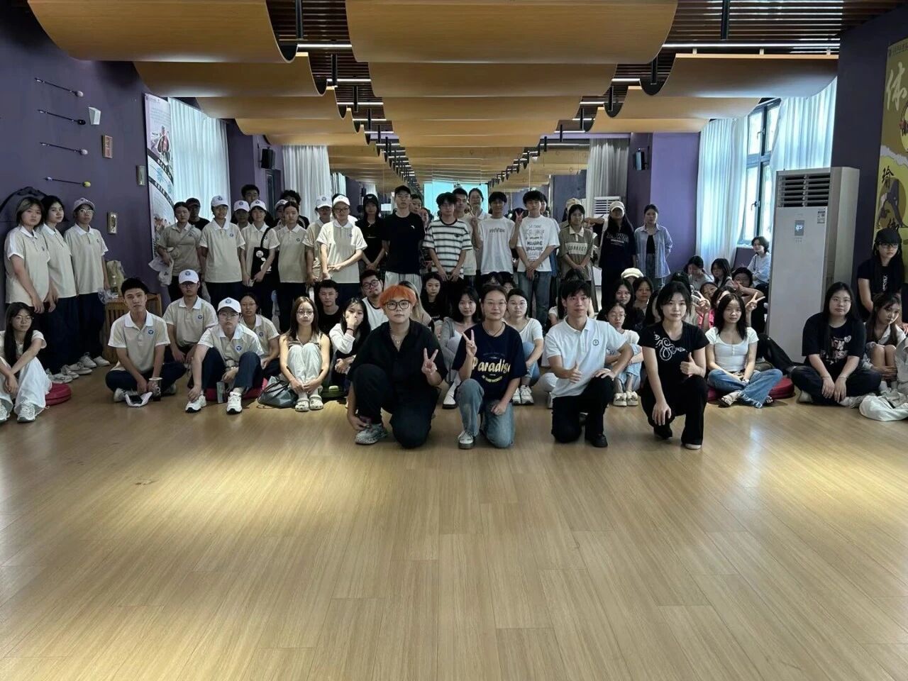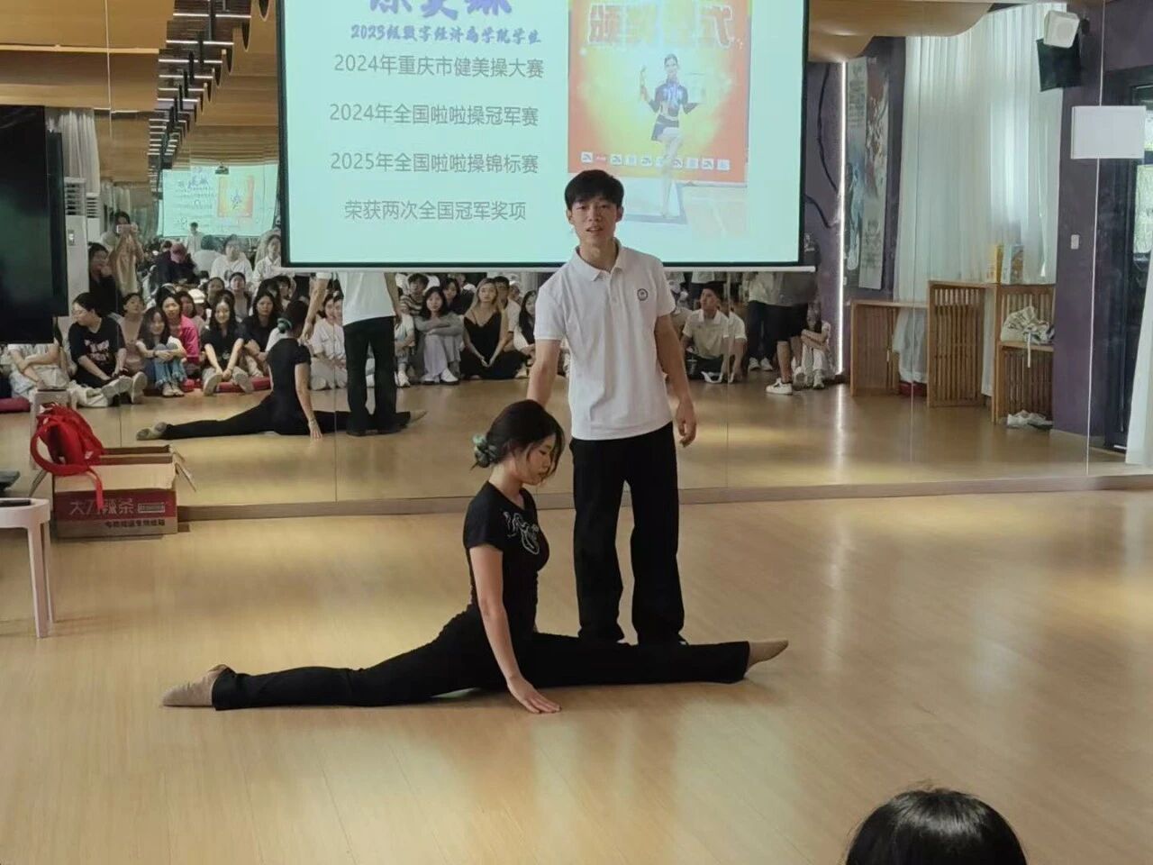 陈美琳学姐的现场示范最吸睛:手臂舒展如羽翼,踢腿利落有劲,动作标准且富感染力。同学们屏息凝视,排练厅里的踏地节奏叩击人心,让大家真切触摸到啦啦操的活力与力量。作为学院2024年啦啦操大赛主要负责人,李政昌学长结合自身赛事组织、团队协作及备赛经历,分享成长收获,还鼓励道:“别害怕尝试,参赛既能展青春风采,更是突破自我的好机会!”