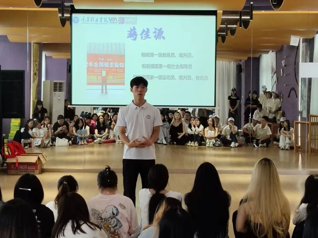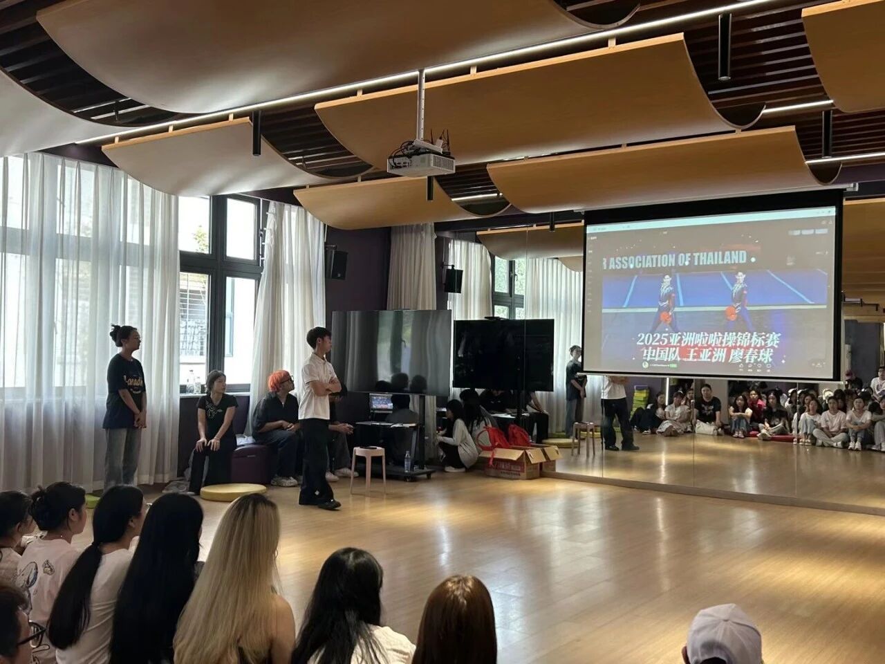 蒋佳源老师从赛事规则、基础理论到备赛细节,讲解细致易懂,还耐心解答疑问,助同学们快速建立对啦啦操比赛的系统认知。现场播放的优秀赛事视频,以活力舞姿、整齐动作展现啦啦操魅力,引得同学们齐刷刷地赞叹。