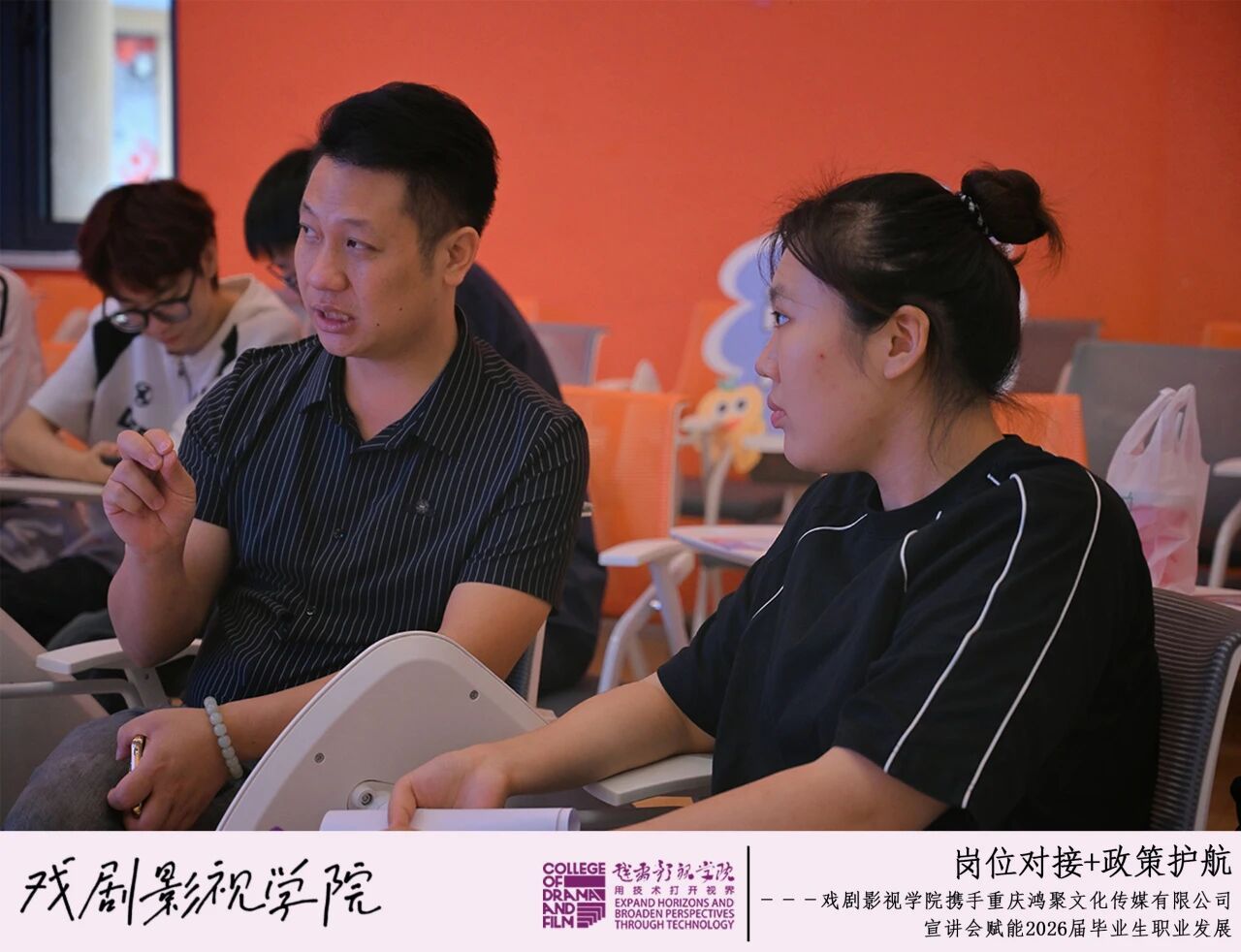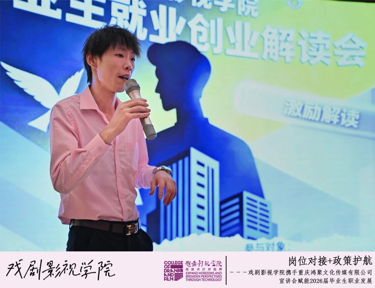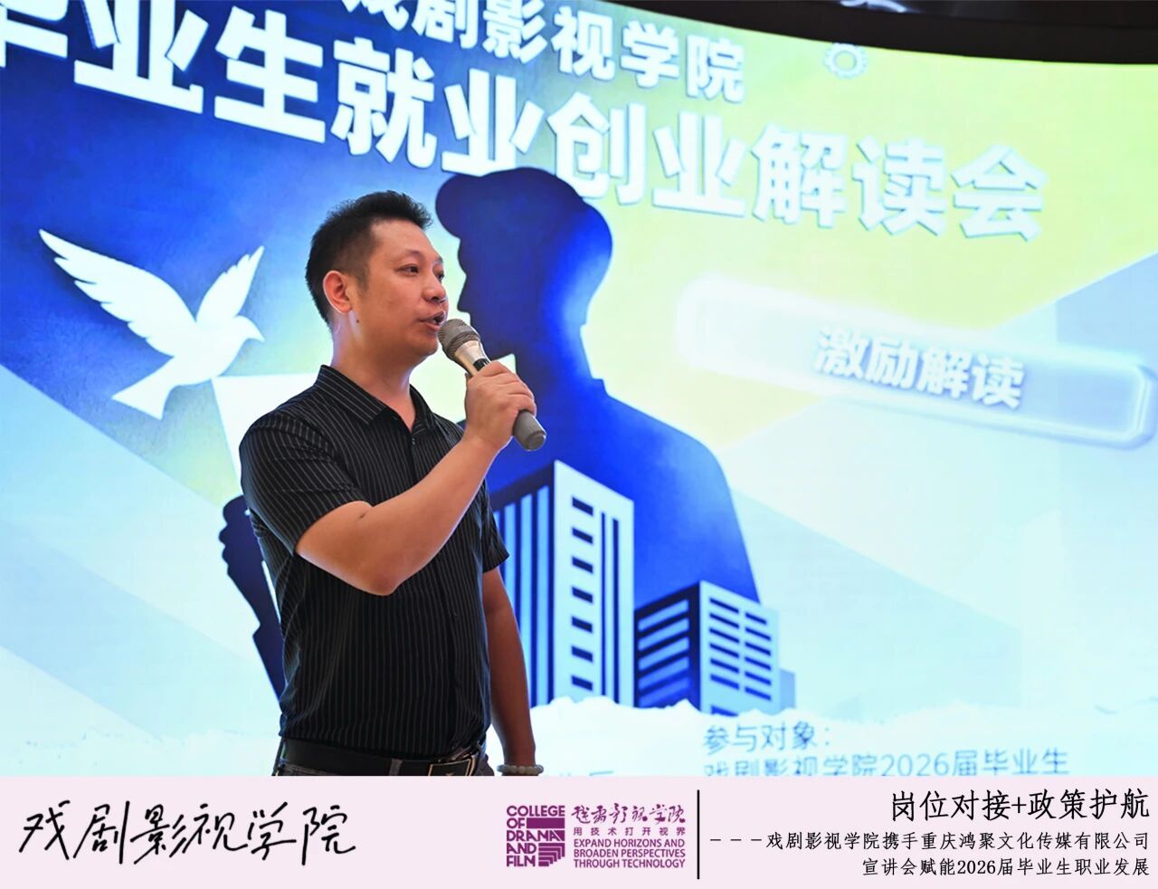 为切实解决2026届毕业生就业方向迷茫问题,9月26日戏剧影视学院联合重庆鸿聚文化传媒有限公司,在古剑书院含光·报告厅举办毕业生就业创业工作讲解暨企业招聘宣讲会,吸引各个学院毕业生到场参与。