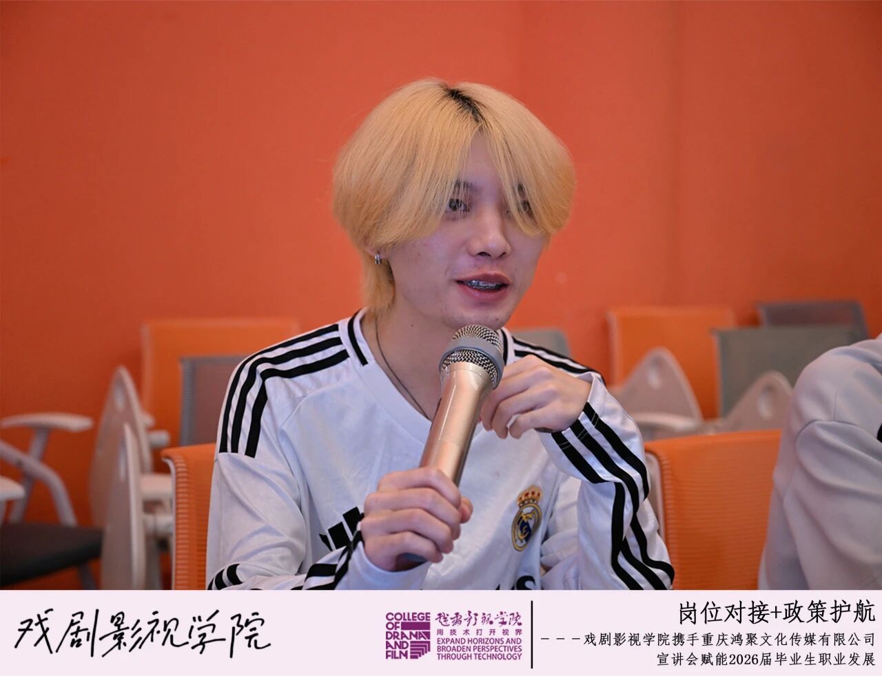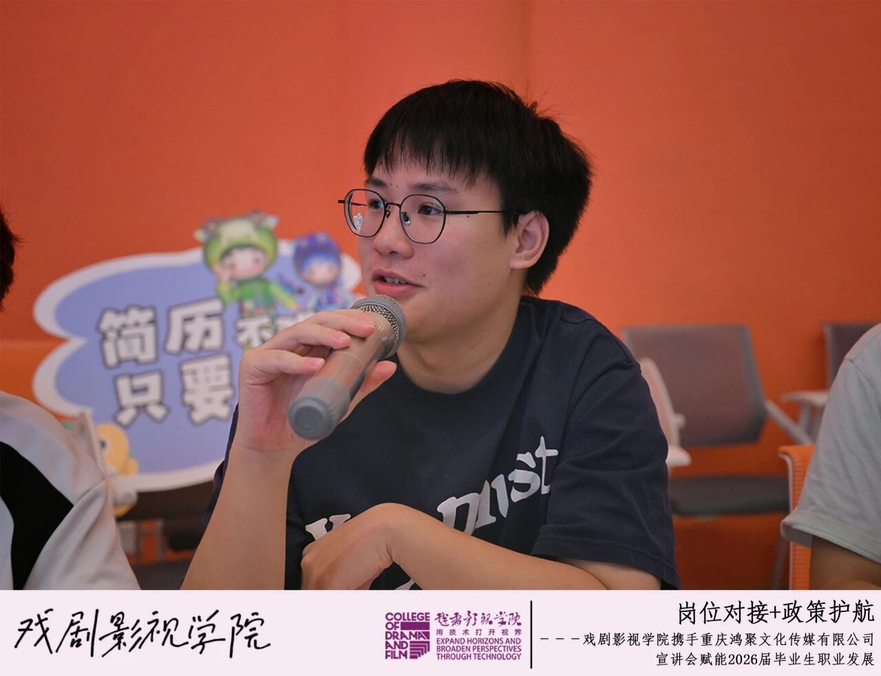 活动伊始,重庆鸿聚文化传媒有限公司总经理围绕企业发展历程、新媒体运营、内容策划等核心业务,向在场学生详解行业趋势与企业人才需求,明确任职要求、薪资体系及晋升路径。同时,负责人展开“一对一”求职问答,同学们针对岗位细节、面试安排等问题直接提问,省去中间环节总经理现场答疑,部分学生现场与企业达成初步意向。