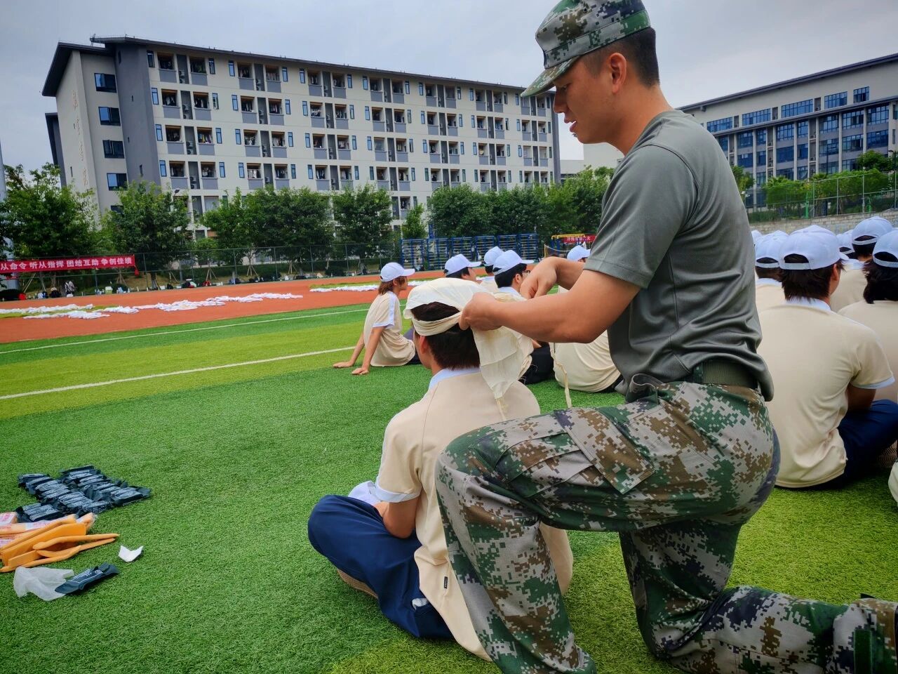 到了分组练习环节,原本严肃的队伍瞬间热闹起来。大家轮流上阵,有人小心翼翼给同伴裹头部,生怕弄乱对方头发;有人给“伤员”绑大臂,紧张得手都有点抖;还有人琢磨腿部包扎的角度,互相调侃“包扎完看着像‘铠甲’”。一番实操下来,学员们不仅把急救技能学到手,还在欢声笑语里多了份默契,算是军训里既实用又有趣的“小收获”。
