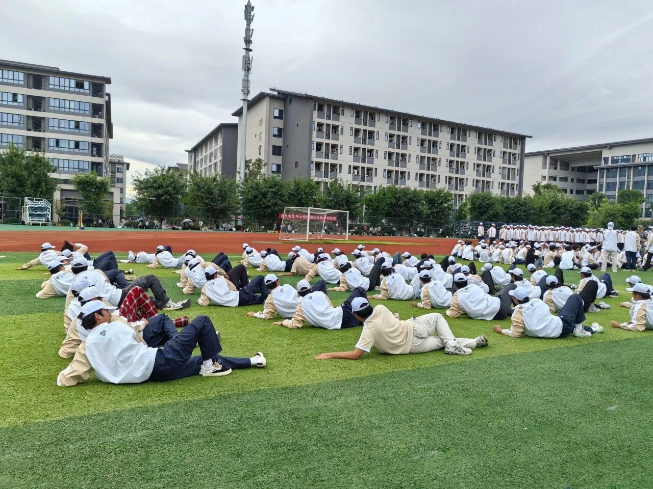 磨红出血的膝盖一次次蹭过粗糙的地面爬行练习,眼前只有前方的目标线;傍晚千人进行匍匐考核,草坪上紧张的心跳声和到达终点的呐喊声交替在一起,每一名学生都咬牙爬向终点。