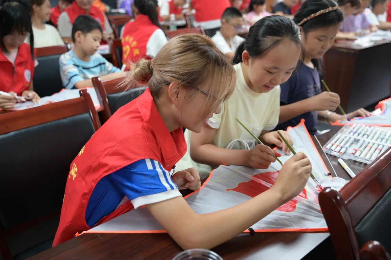 风筝绘画创作环节,志愿者分组行动,耐心为每位小朋友提供指导。从调色、构图到细节勾勒,志愿者用鼓励的话语引导孩子们发挥想象。孩子们拿起五彩画笔,将对双节的理解与祝福融入创作,在空白风筝上描绘图案,完成了一件件充满童趣与爱国情感的作品。