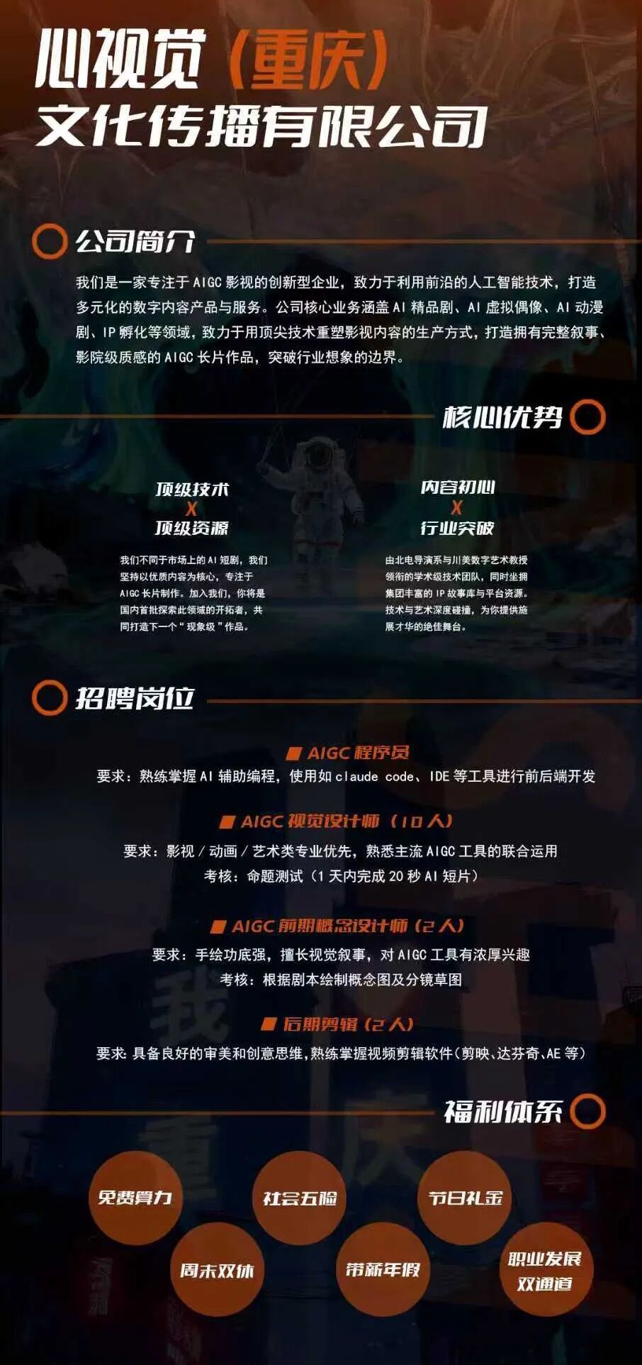 心视觉(重庆)文化传播有限公司作为一家扎根于山城、放眼于未来的创新型文化企业,正式启动新一轮招聘计划。我们致力于打造一支精通AIGC技术的前沿团队,现面向全球英才抛出橄榄枝,诚邀有志于在AI创意领域大展身手的伙伴加入团队,共同探索视觉叙事的无限可能。