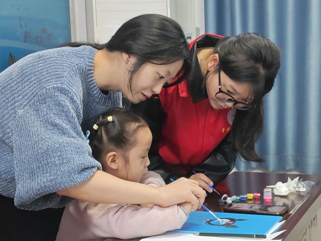 随后的动手实践环节,让活动氛围更加浓厚。在志愿者的指导下,孩子们化身“小小艺术家”,体验吹塑纸版画创作。从构思构图、勾勒线条,到刻板、调色、拓印,每一步都充满新奇与喜悦。志愿者手把手答疑,孩子们专注尝试,现场艺术气息浓厚,稚嫩脸庞满是认真与愉悦。