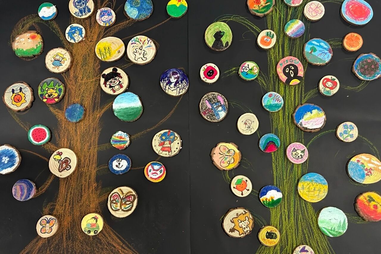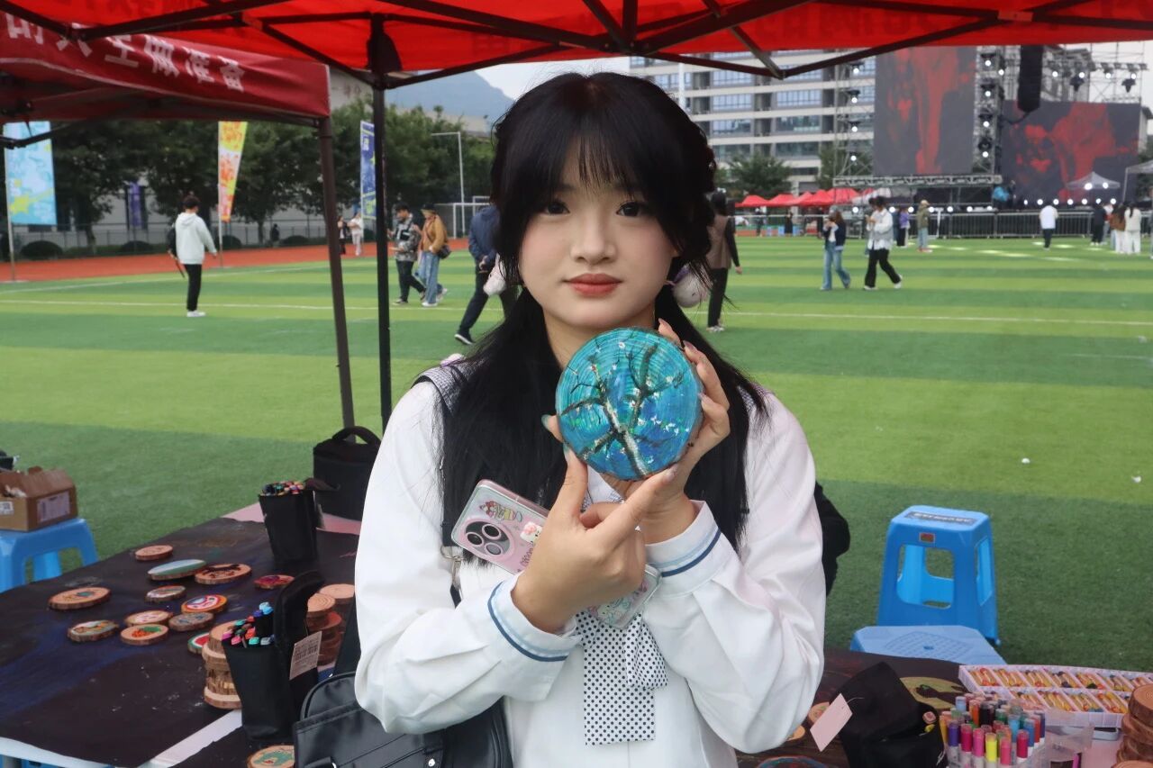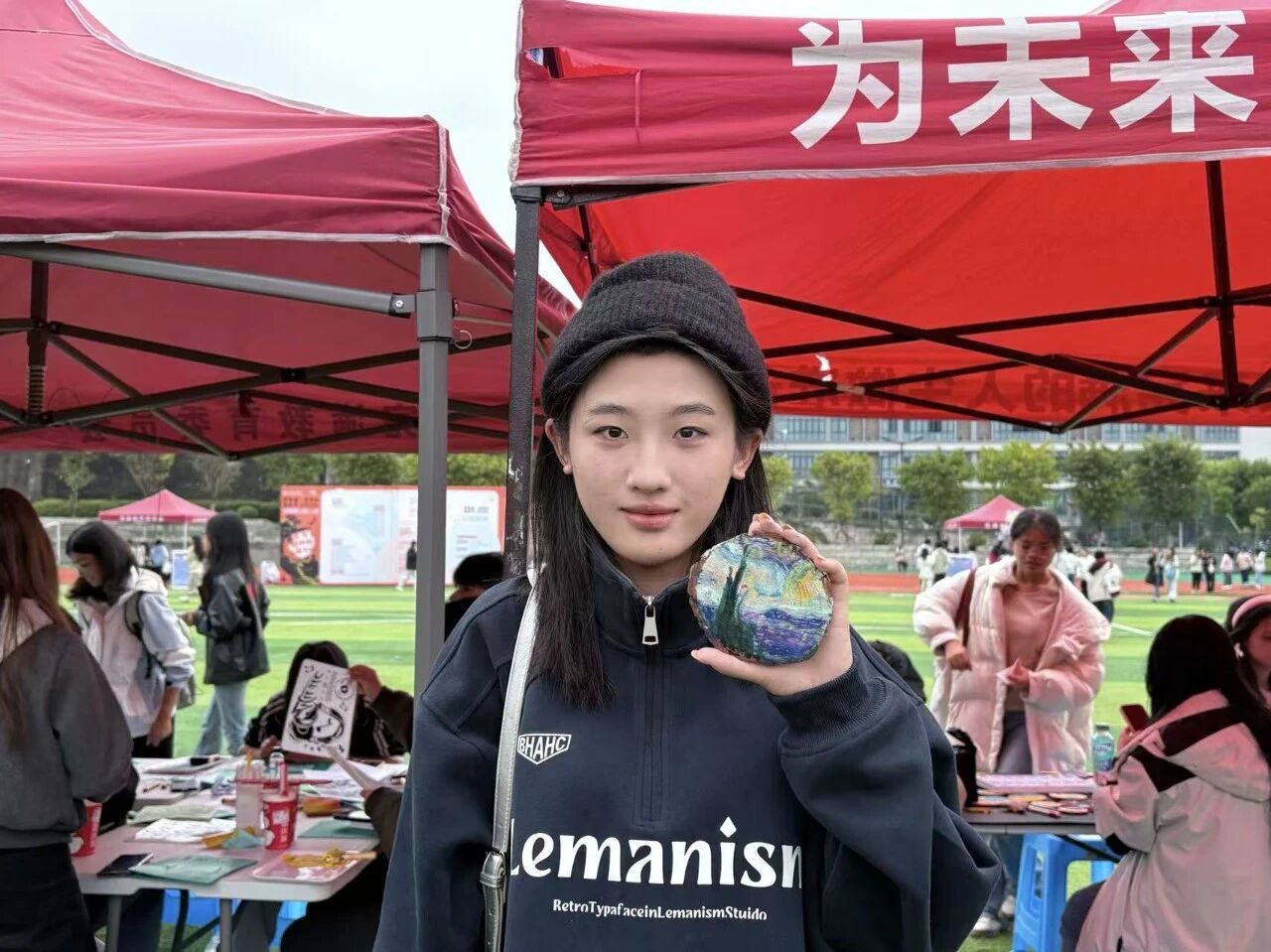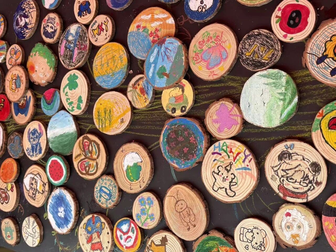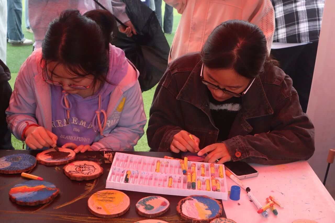 活动现场,铺陈整齐的木片、色彩斑斓的画笔前围满了热情的参与者。有人绘下绚烂的星空,寄托对未来的憧憬;有人勾勒可爱的卡通形象,彰显童真与活力;有人用抽象的线条和色块,表达内心的独特情绪;还有人将移通校园的标志性建筑、音乐节的音符元素融入画作,赋予作品专属记忆点。油画棒的细腻质感与马克笔的鲜明色彩相互映衬,每一张木片都成为独一无二的青春注脚,短短数小时内,数百张风格迥异的木片画作新鲜 “出炉”,摆满了活动区域,成为现场一道亮眼的风景线。