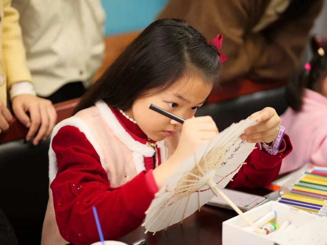 动手实践环节,孩子们在志愿者的专业指导下,亲身参与油纸伞绘画创作。他们手握画笔在洁白伞面勾勒心中的红色图景,将革命精神与艺术创意深度融合,在锻炼动手能力的同时,于潜移默化中深化了对家乡红色历史的认知与理解。