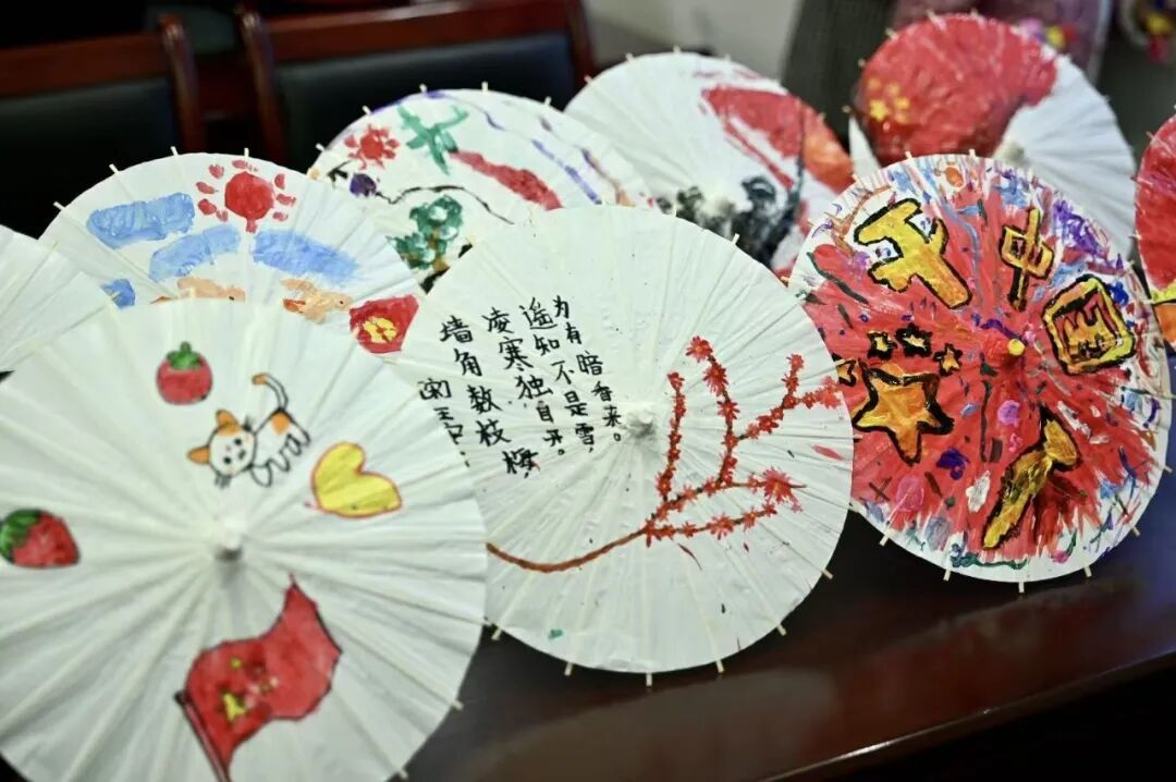 作品展示环节将活动推向高潮。孩子们自豪地展示亲手绘制的油纸伞:闪耀的红星寓意光明希望,傲雪红梅象征坚韧不屈,每幅作品都凝聚着对红色文化的真挚感悟。在创作分享中,孩子们用稚嫩语言讲述作品背后的故事,脸上的笑容藏不住对非遗工艺的喜爱。最后,全体人员手持油纸伞合影,缤纷伞面与纯真笑脸交相辉映,为这场“非遗+红色”体验定格下珍贵记忆。