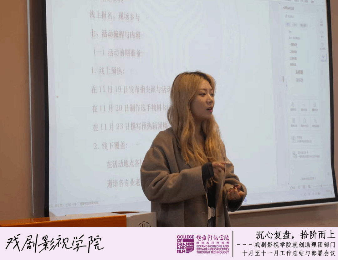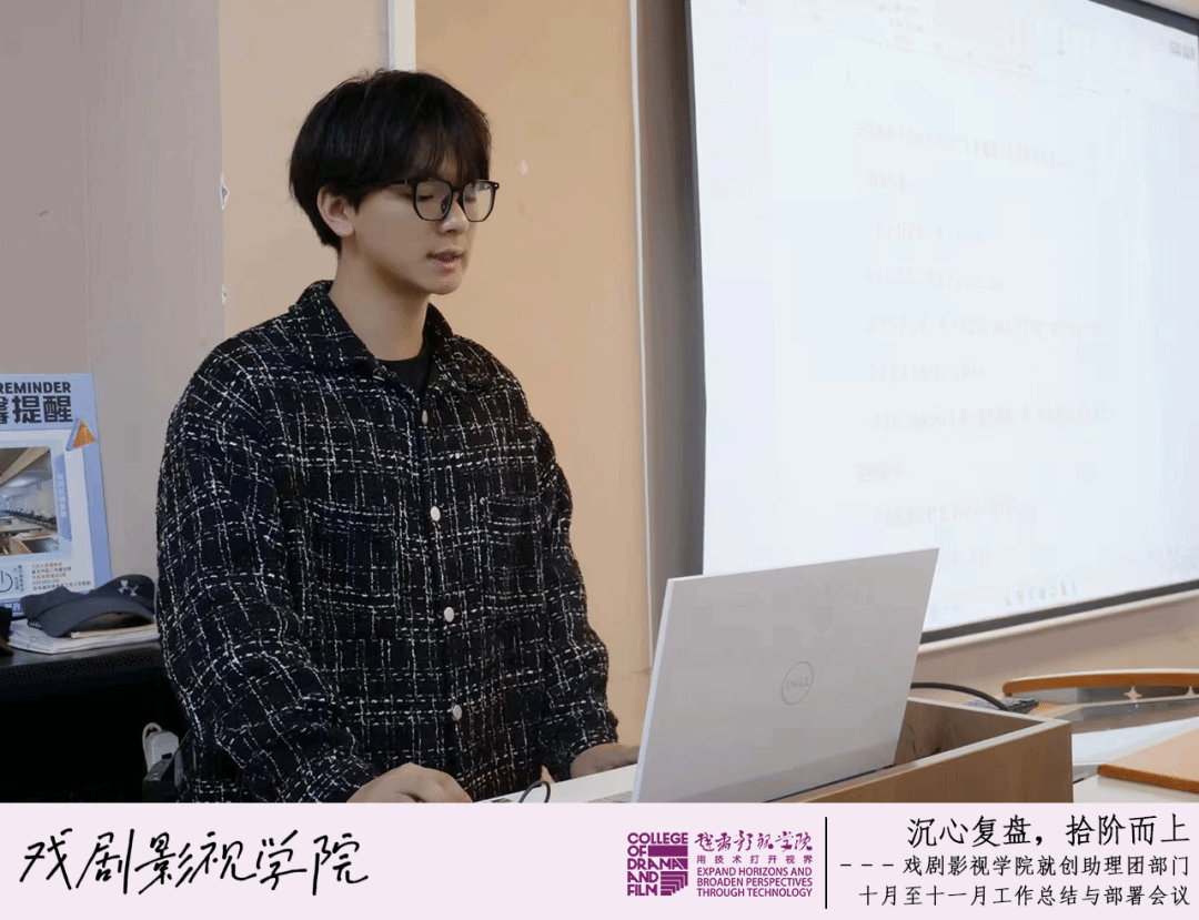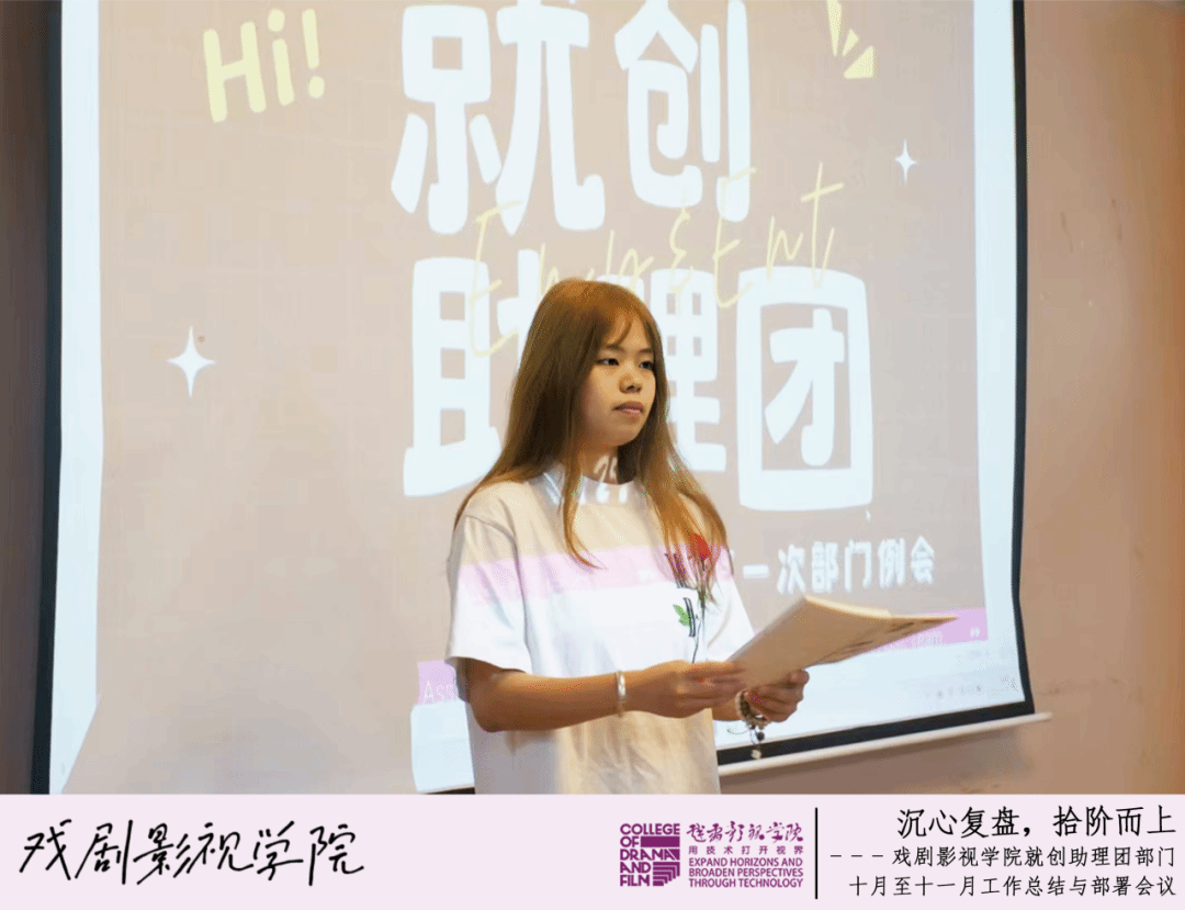 为深入复盘十月各项活动成效,稳步推进下一阶段工作高质量开展,戏剧影视学院就创助理团先后于11月7日下午在瀛溪书院·一二三会议室召开干部工作复盘会,11月11日中午在綦河书院·小石潭多功能活动室召开部门干事部署会,通过分层研讨明确工作方向、凝聚奋进共识。
