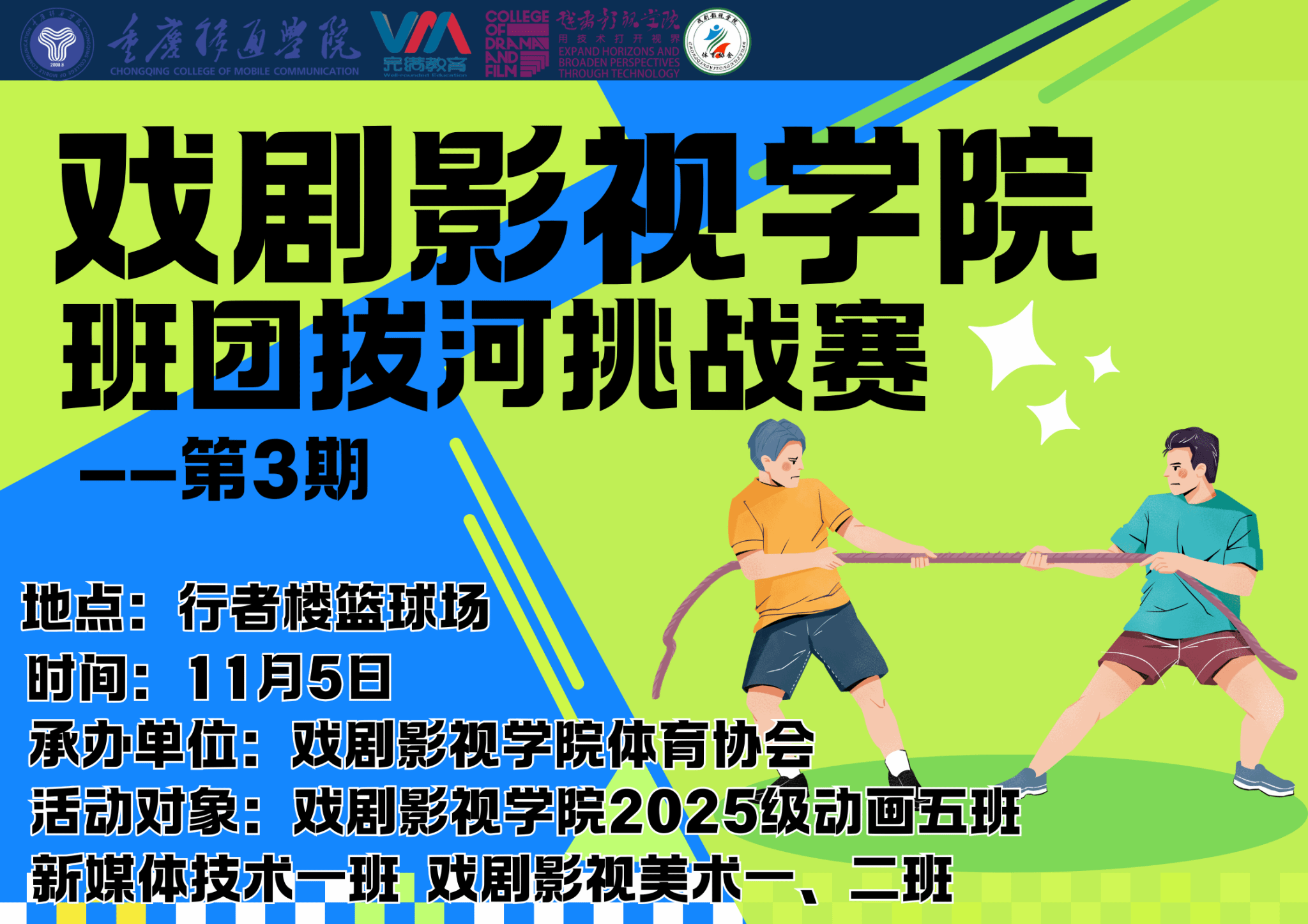 为贯彻“以体育人”的培养要求,戏剧影视学院体育协会组织策划每周三开展2025级班级拔河挑战赛,活动将“劲往一处使”的体育精神与团队合作、集体荣誉等核心素养相结合,旨在增强基层班团学生集体凝聚力,培养坚韧意志与健康运动习惯。