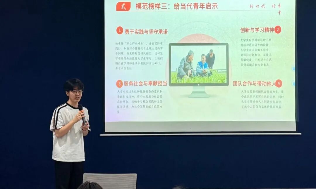 榜样分享与热点聚焦环节,李鑫阳同学分别分享了“轮椅上的创业先锋”杨淑婷、帕提古丽·艾比布拉和种田“好把式”袁本刚三位扎根一线的先进人物事迹,向同学们传递了坚守与奉献的精神力量。三位榜样在平凡岗位上的专业坚守与实干担当,使同学们深受触动,不约而同地表示,要将这种“把小事做实、把实事做细”的精神融入自身成长。