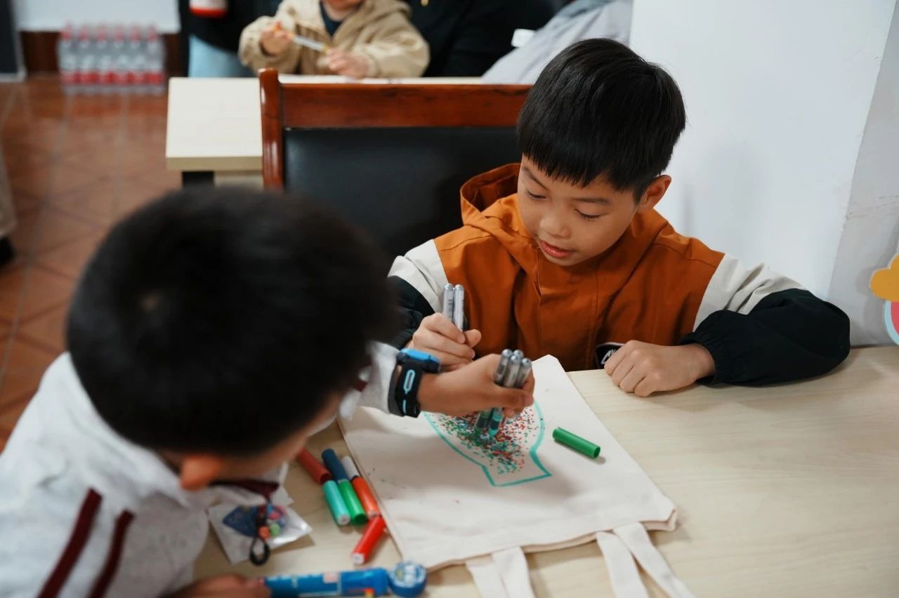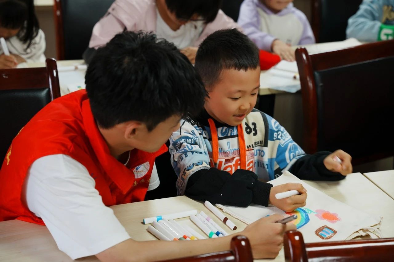 随后,在志愿者的组织下,小朋友们或独自专注构思,或与邻近小伙伴轻声交流创作灵感,现场氛围专注而温馨。志愿者穿梭于每位小朋友之间,为他们提供个性化协助,从色彩比例的建议到构图布局的优化,志愿者们始终以耐心细致地陪伴支持创作。整个创作场景中,画笔在纯白帆布袋上轻盈游走,小朋友们在无压力的环境中全情投入,让每一道线条、每一块色块都成为内心世界的真实映射。