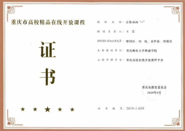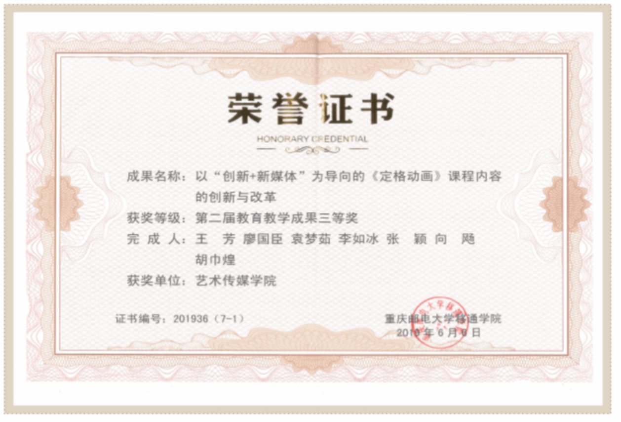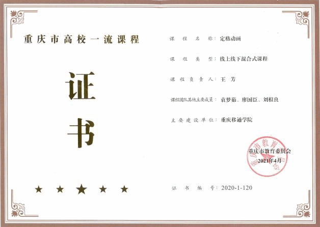 本课程在2019年获省部级精品课程、校级精品课程,2020年获市级一流线上线下混合式课程,拟推 2021 年国家级一流课程,负责人获 2018-2020 年度重庆市在线课程先进。2024 年负责人讲授的《真人定格动画》课程获教师创新教学大赛省部级三等奖;《以“创新+新媒体”为导向的〈定格动画> 课程内容的创新与改革》获校级教学成果三等奖。