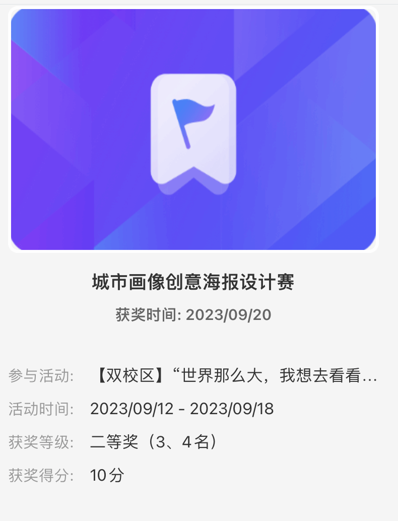 经过胡佳佳的不懈努力,她的综合测评连续两学期名列年级第七,指尖派已达300多分,同时荣获移通优秀学生二等奖学金,荣获“三好学生”的称号。同时将专业所学与实际问题相结合,获得重庆市助残文创设计大赛三等奖;设计的“交通文明,你我通行”主题海报于600余份作品中脱颖而出,获区级一等奖;而在【双校区】“世界那么大,我想去看看”城市画像创意海报设计赛获得二等奖。重庆市“残疾预防,青春同行”志愿创意作品征集大赛优秀奖。重庆移通学院"残疾预防,青春同行”志愿创意作品征集大赛校级二等奖。