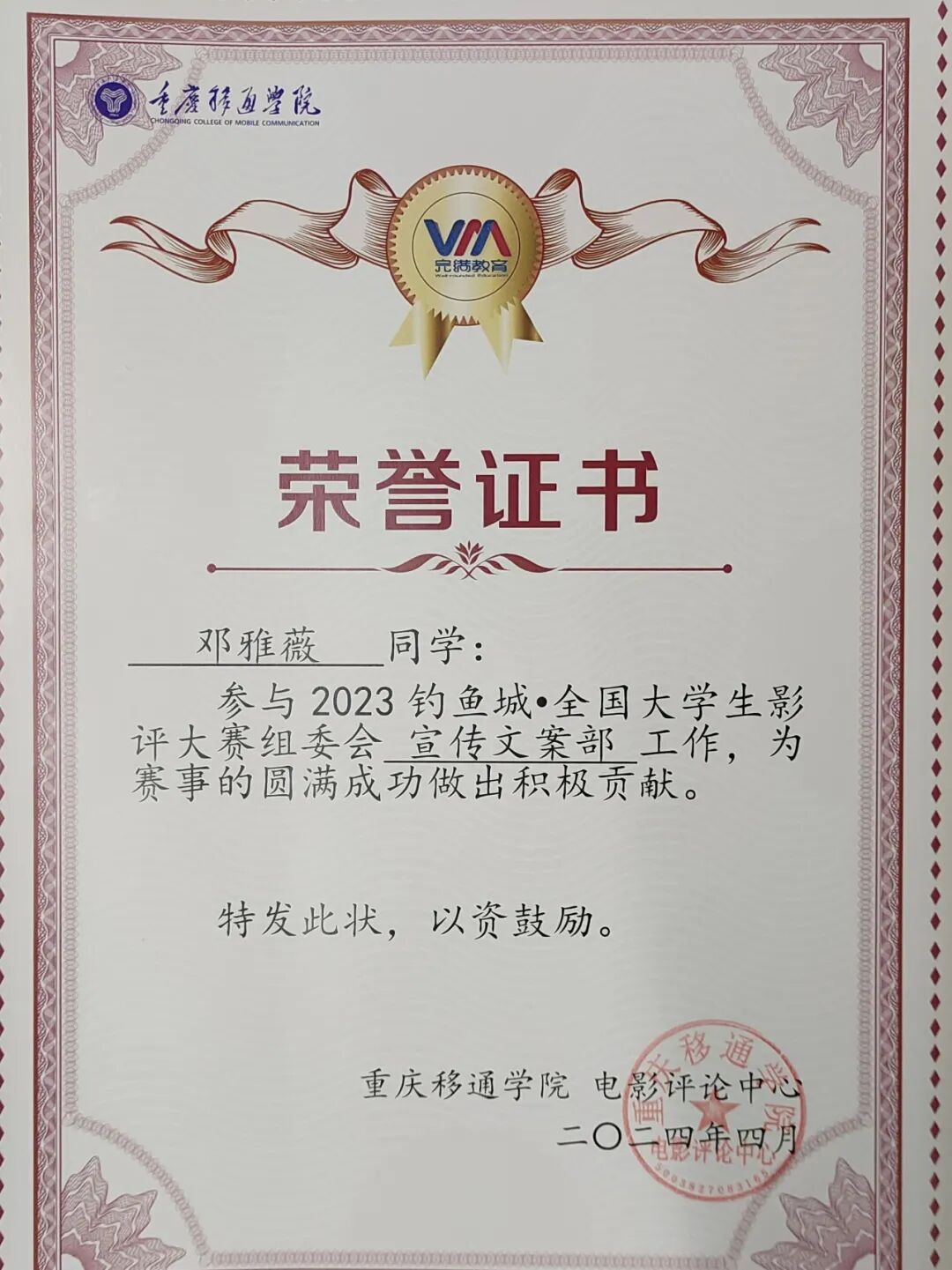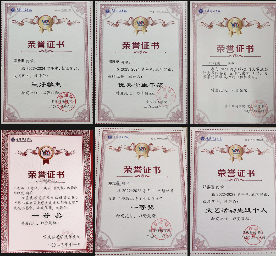 在学习方面,邓雅薇同学始终以严谨扎实的态度追求卓越,学业成绩与综合测评成绩均位列专业第一,荣获移通优秀学生奖学金一等奖和班级先进个人奖。同时,她也在积极参与全国影评大赛、书刊投稿、奥斯卡相关活动等,不断丰富专业知识,挑战自我。凭借出色的表现,获得戏影学院作品汇报展一等奖。积极参加大学生创新创业活动与讲座、青少年模拟联合国大会等,有效提升了写作能力、辩论能力与创新创业思维。