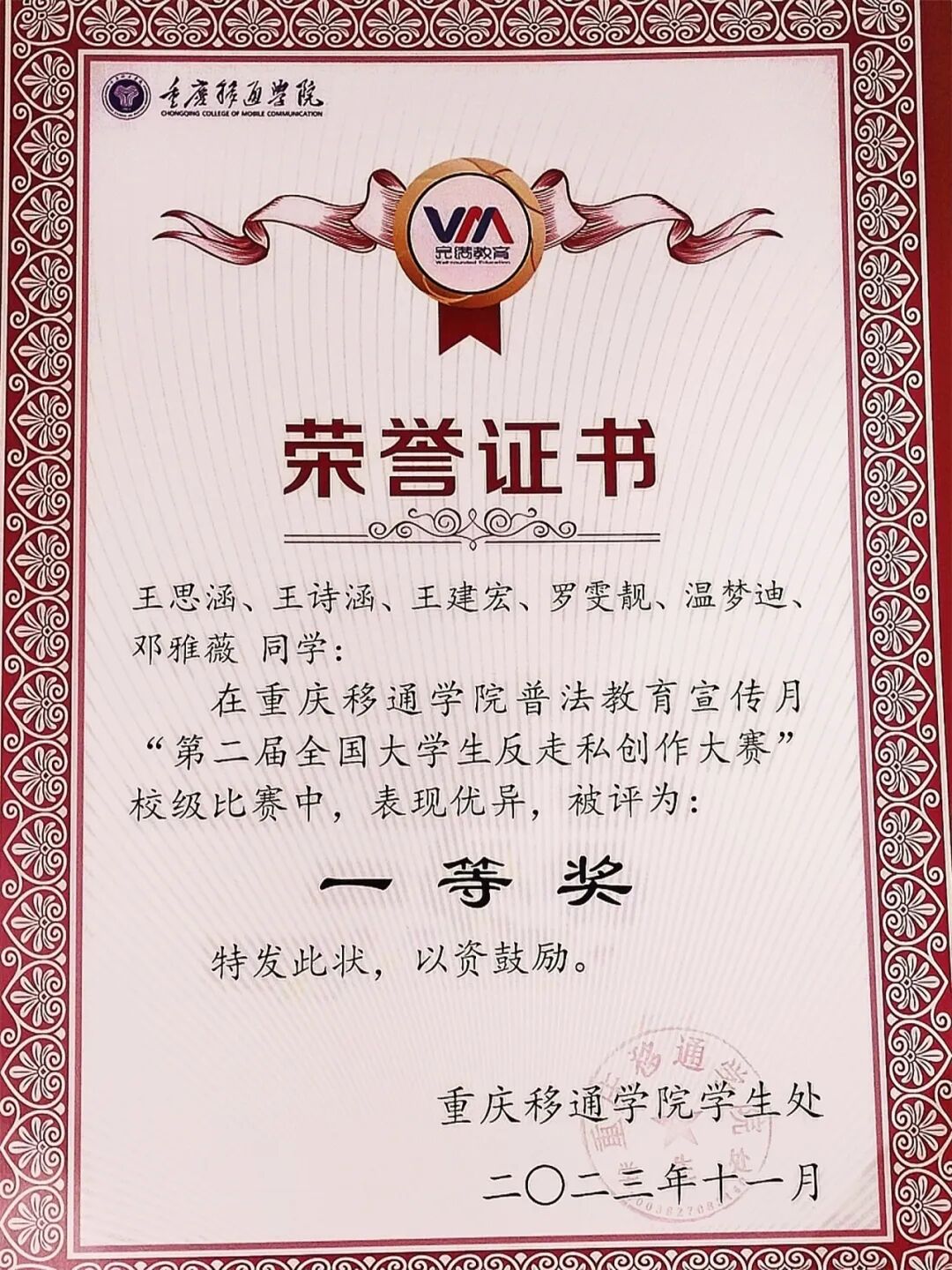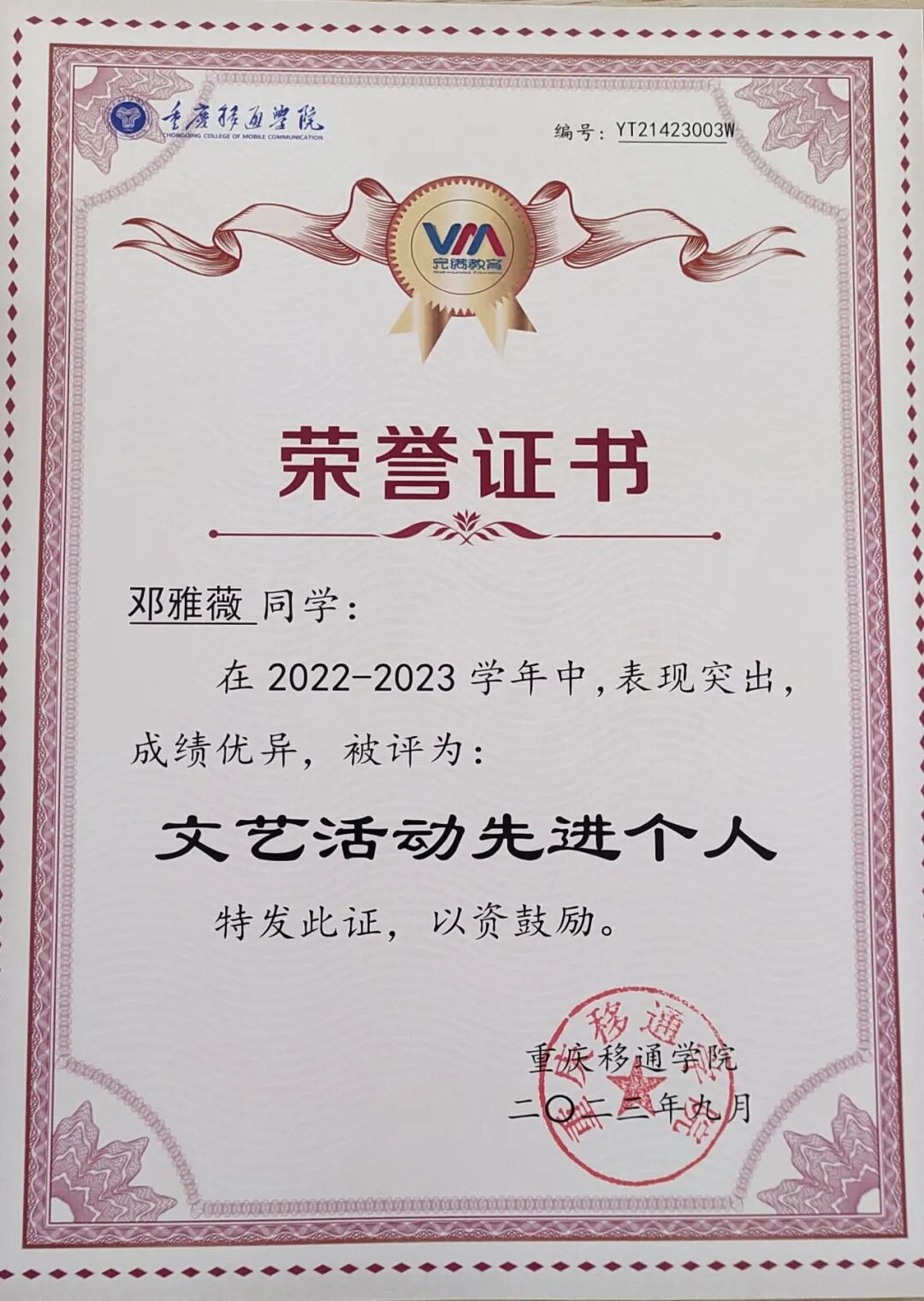 邓雅薇,共青团员,2022级戏剧影视文学2班,于2022年9月入学。入校以来荣获国家励志奖学金、移通优秀学生奖学金一等奖,第二届全国大学生反走私创作大赛一等奖、第十届“名角杯”校园戏剧节“最具潜力艺术家奖”“原创剧本优秀奖”、“普及科学知识·弘扬红色文化”讲解大赛二等奖、“喜庆二十大,时代新人讲好故事”优秀奖、“学以致用,乐在綦中”英语口语比赛优秀奖等校级奖项十余项,荣获“三好学生”、“优秀共青团干部”、“优秀学生会干部”、“文艺活动先进个人”等十项荣誉称号。