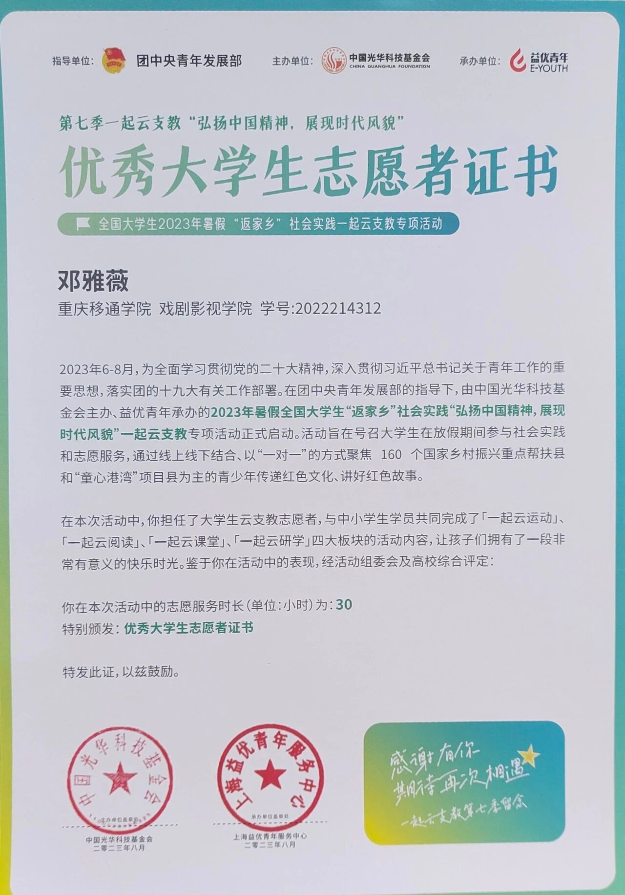 伟大时代呼唤伟大精神,崇高事业需要榜样引领。榜样是照亮前路的灯塔,是催人奋进的号角,是塑造品格的标杆。为发挥榜样的示范引领作用,戏剧影视学院特别推出“戏影榜样”栏目。通过讲述青年榜样的故事,使戏娃们向模范看齐,共同成长为有理想、敢担当、能吃苦、肯奋斗的新时代好青年。今天,让我们一同走进本期的榜样故事——邓雅薇。
